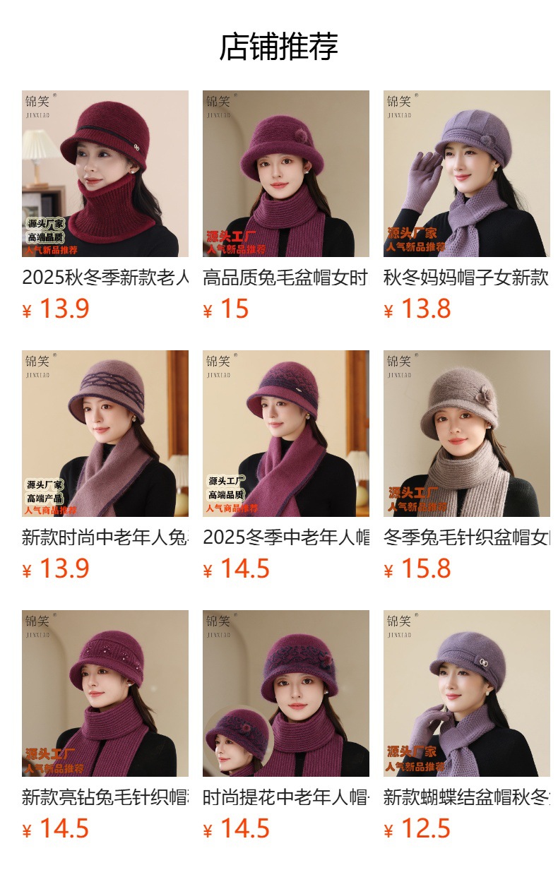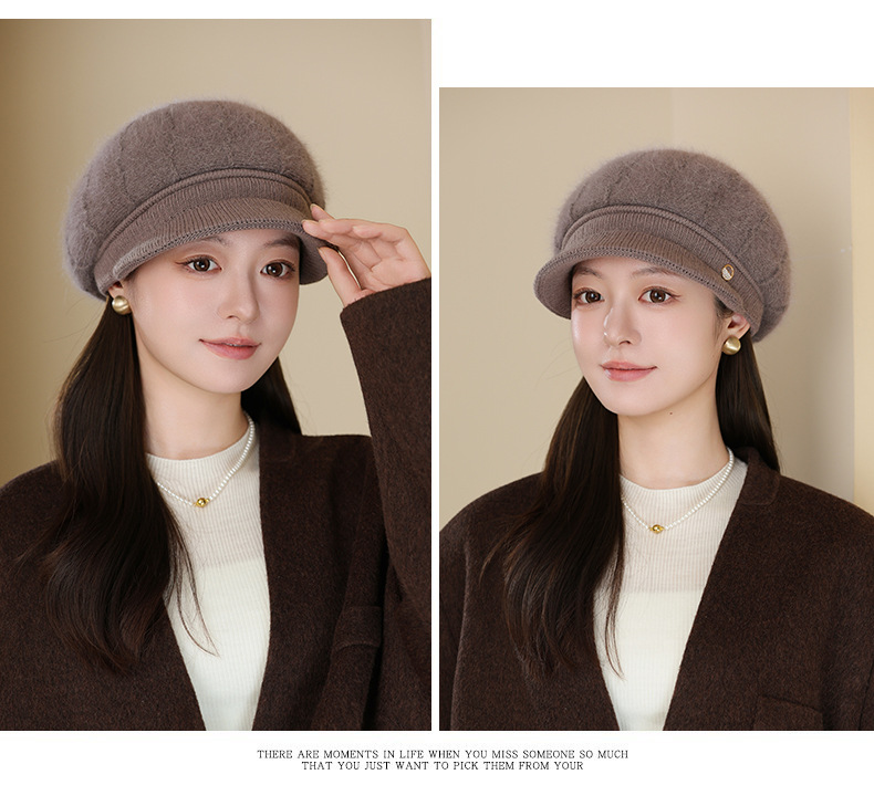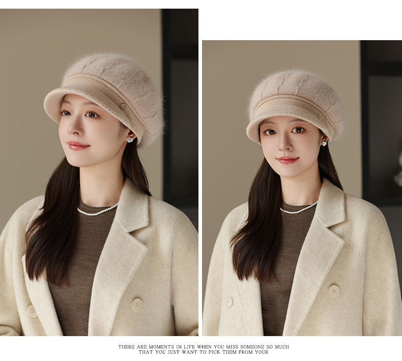 秋冬2025新款纯色兔毛针织帽中老年女优雅气质保暖防风鸭舌帽批发