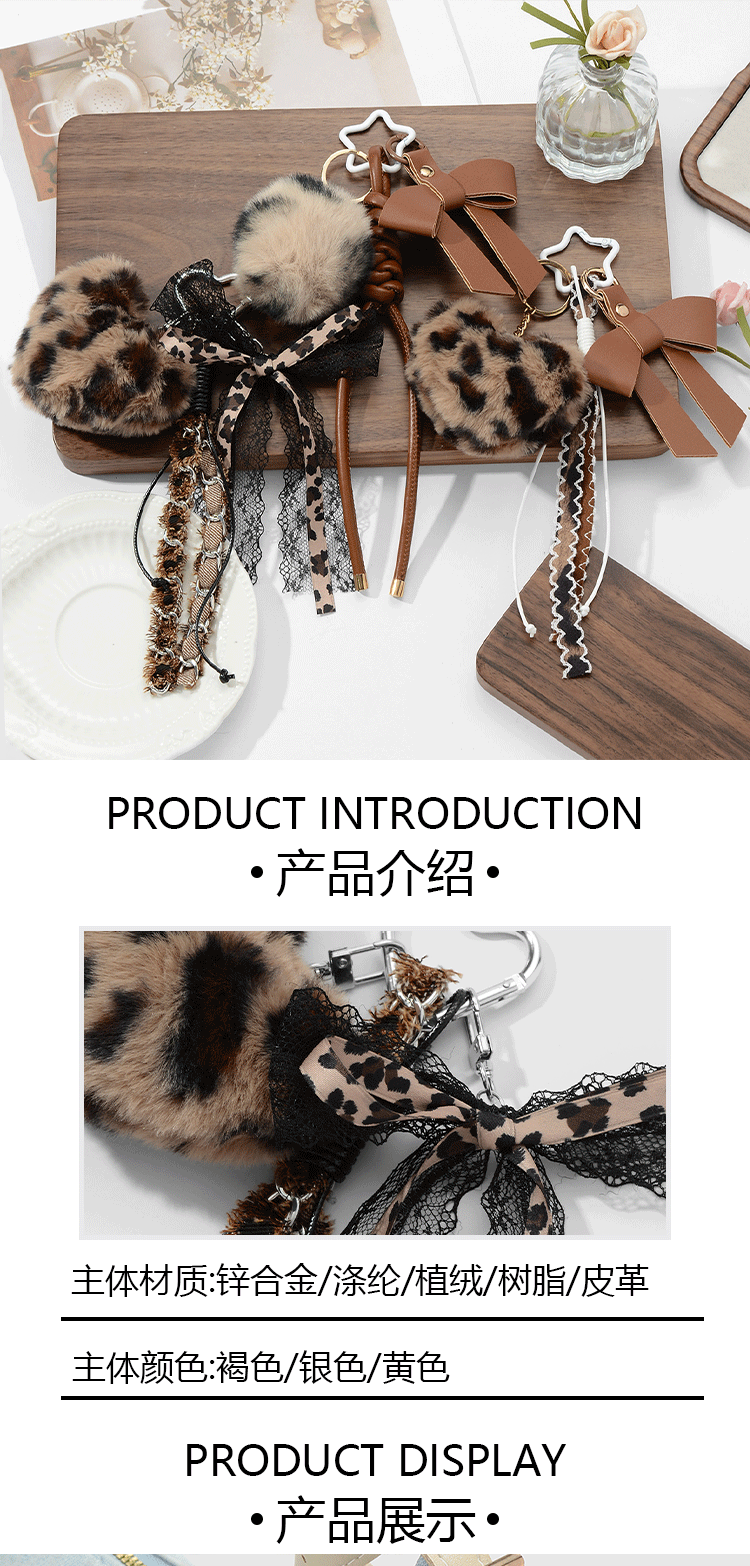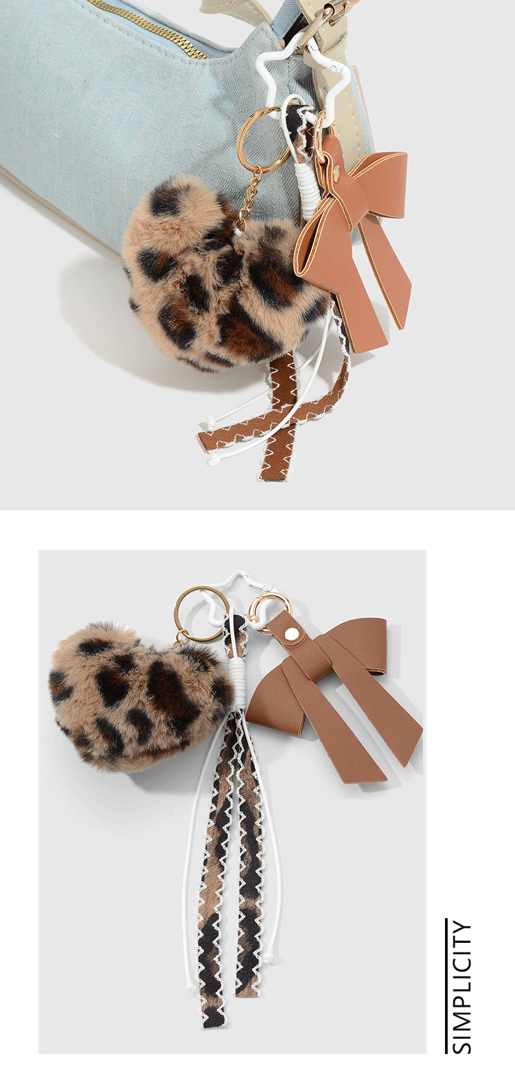 精致时尚百搭复古风毛绒豹纹爱心小球皮革蕾丝蝴蝶结编织绳钥匙扣