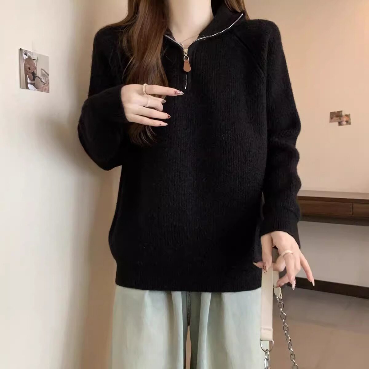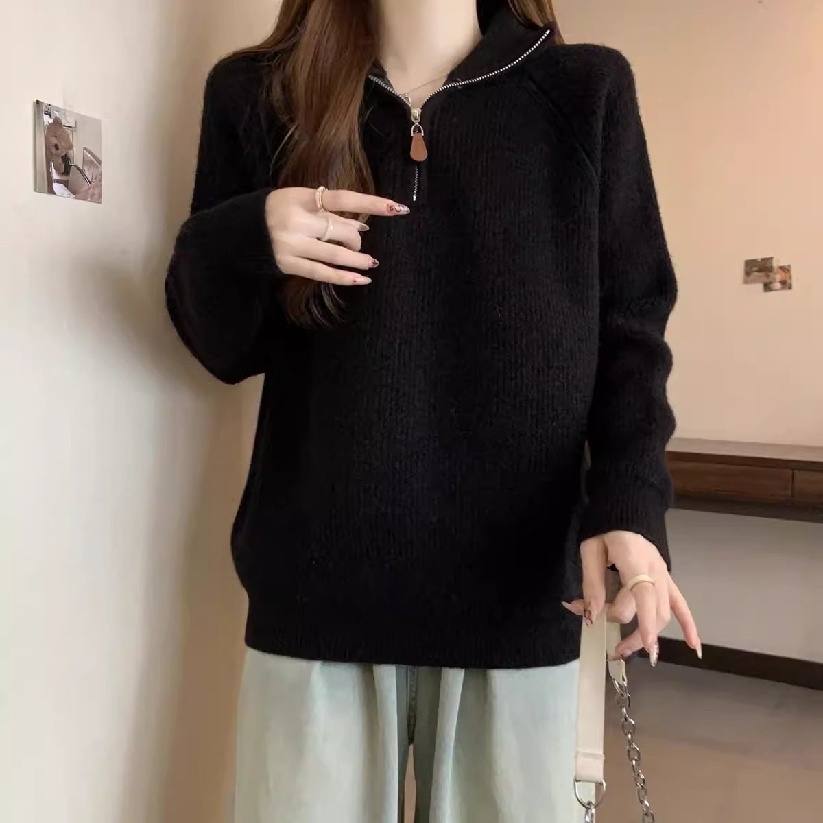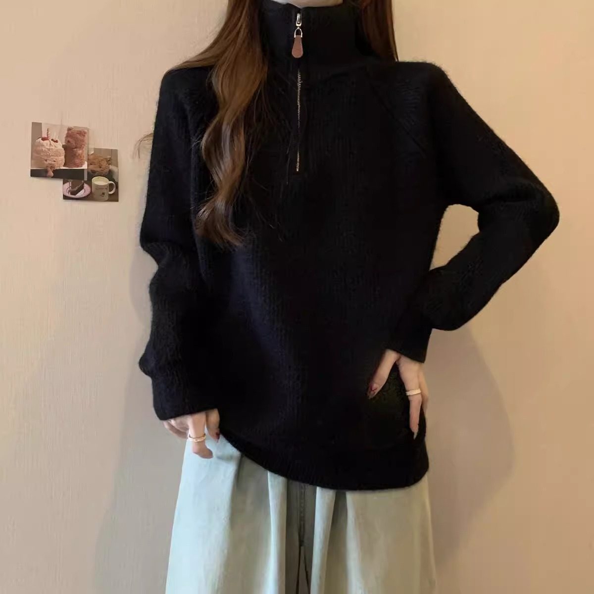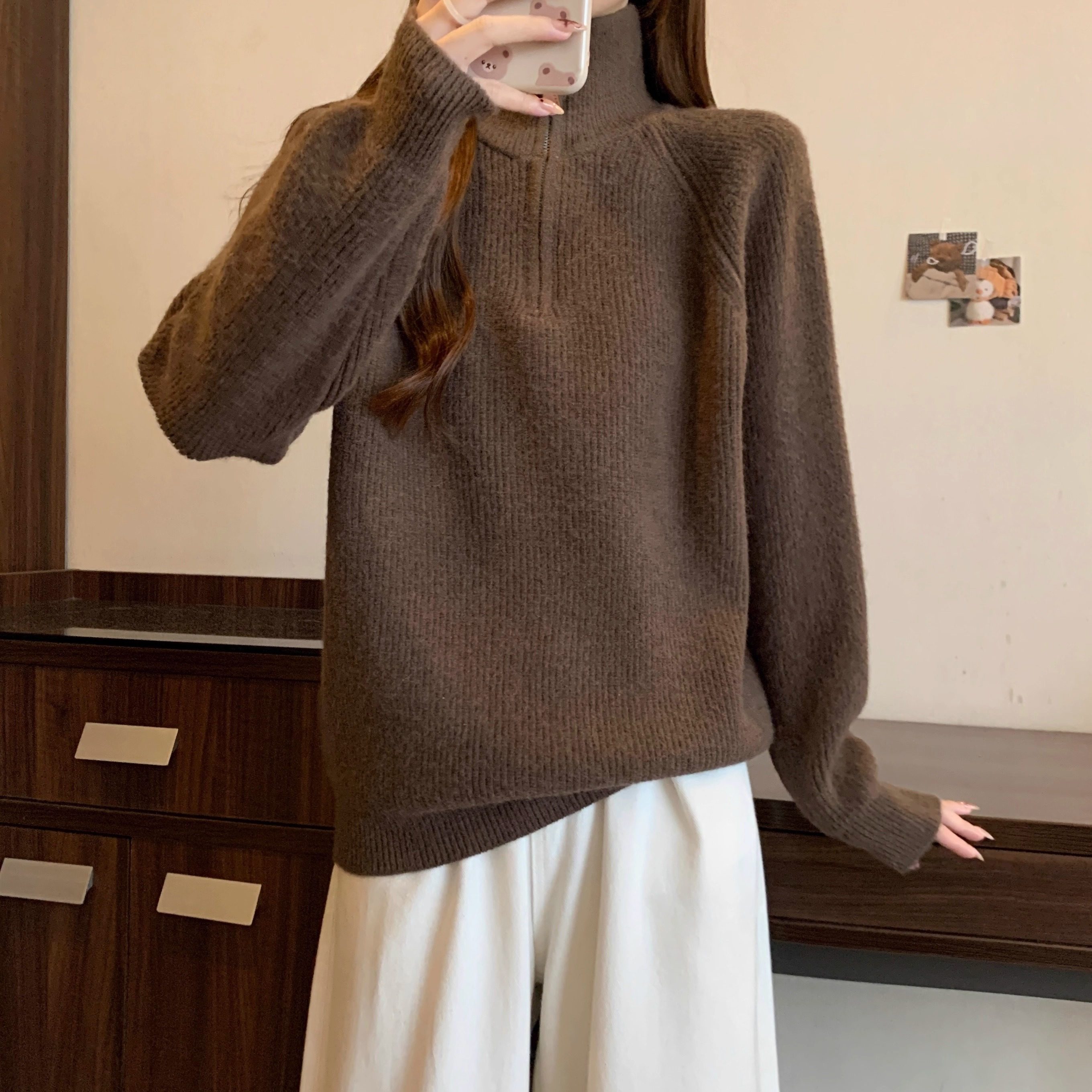 秋冬半开领女士针织衫韩版百搭立领宽松慵懒风毛衣加厚针织打底衫