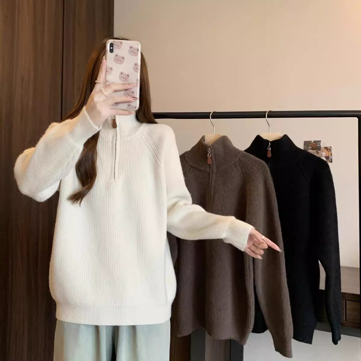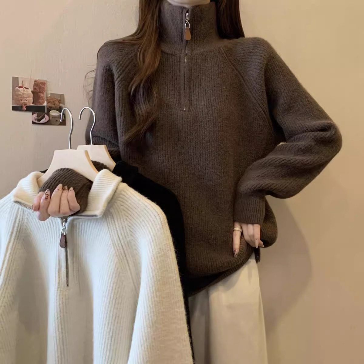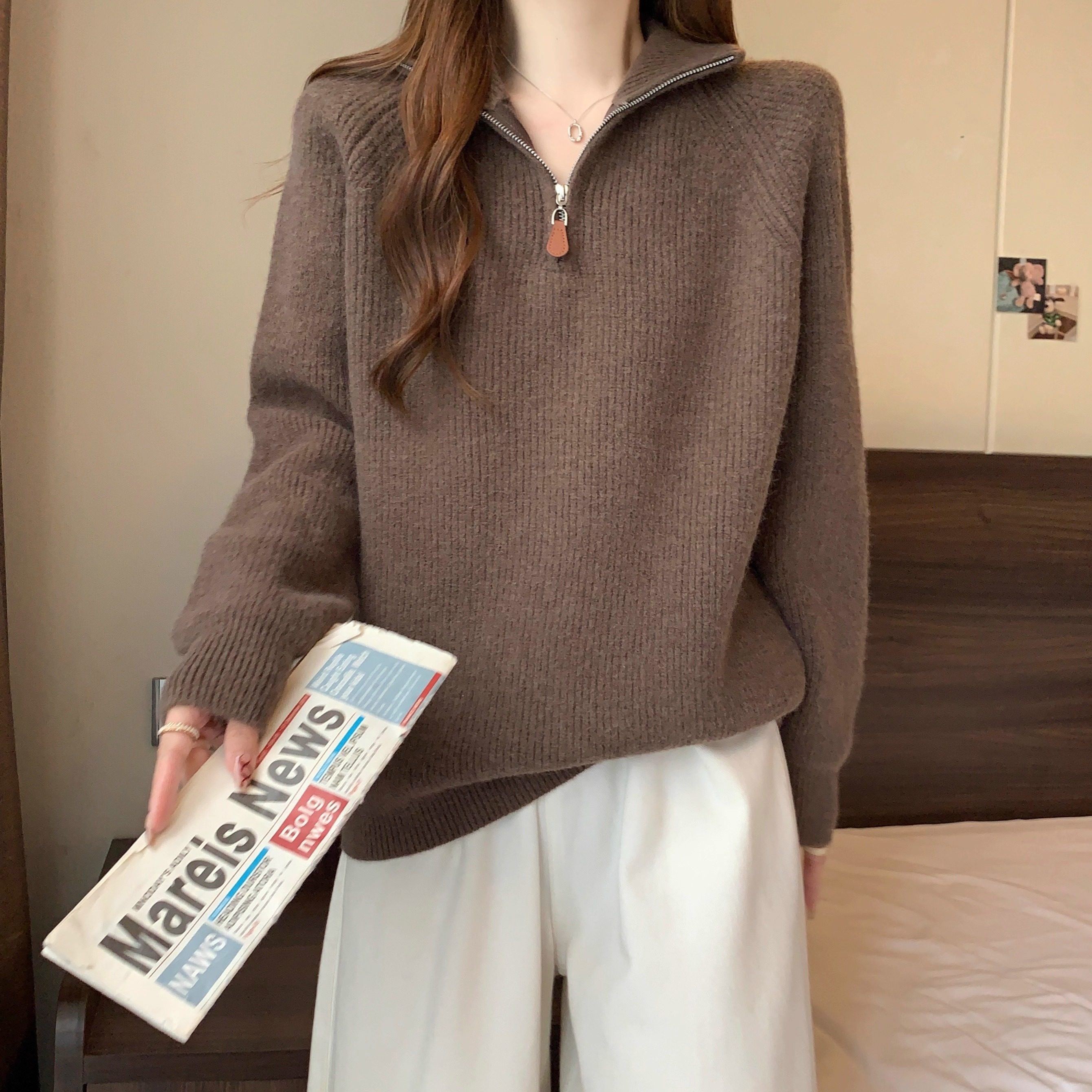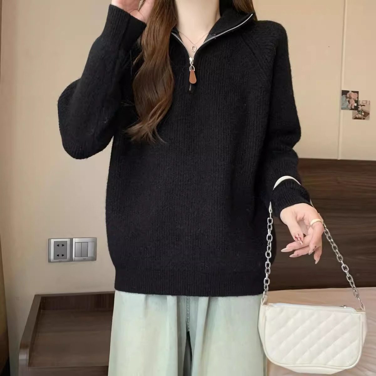 秋冬半开领女士针织衫韩版百搭立领宽松慵懒风毛衣加厚针织打底衫