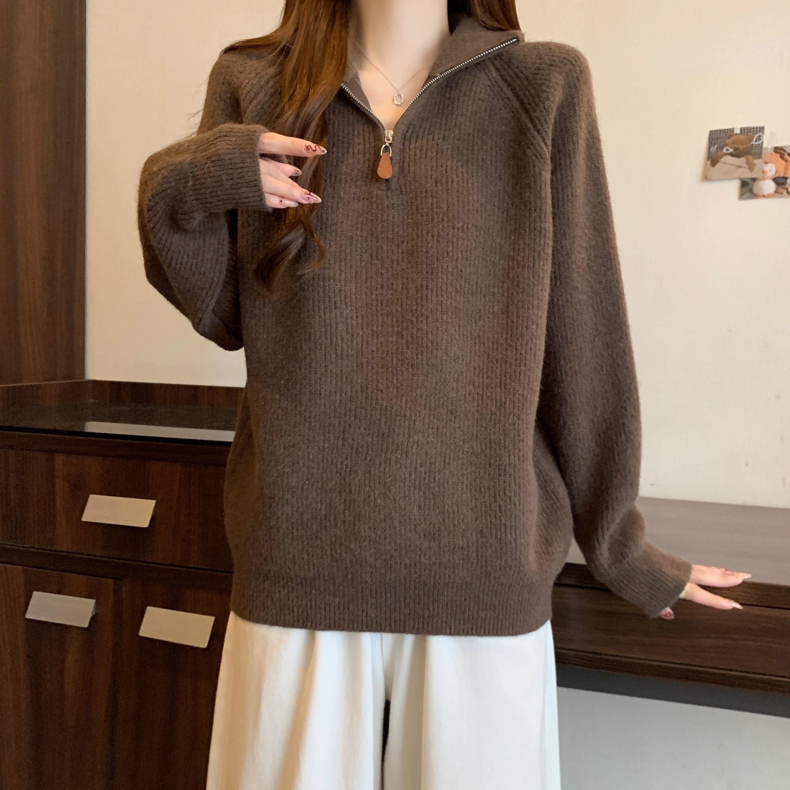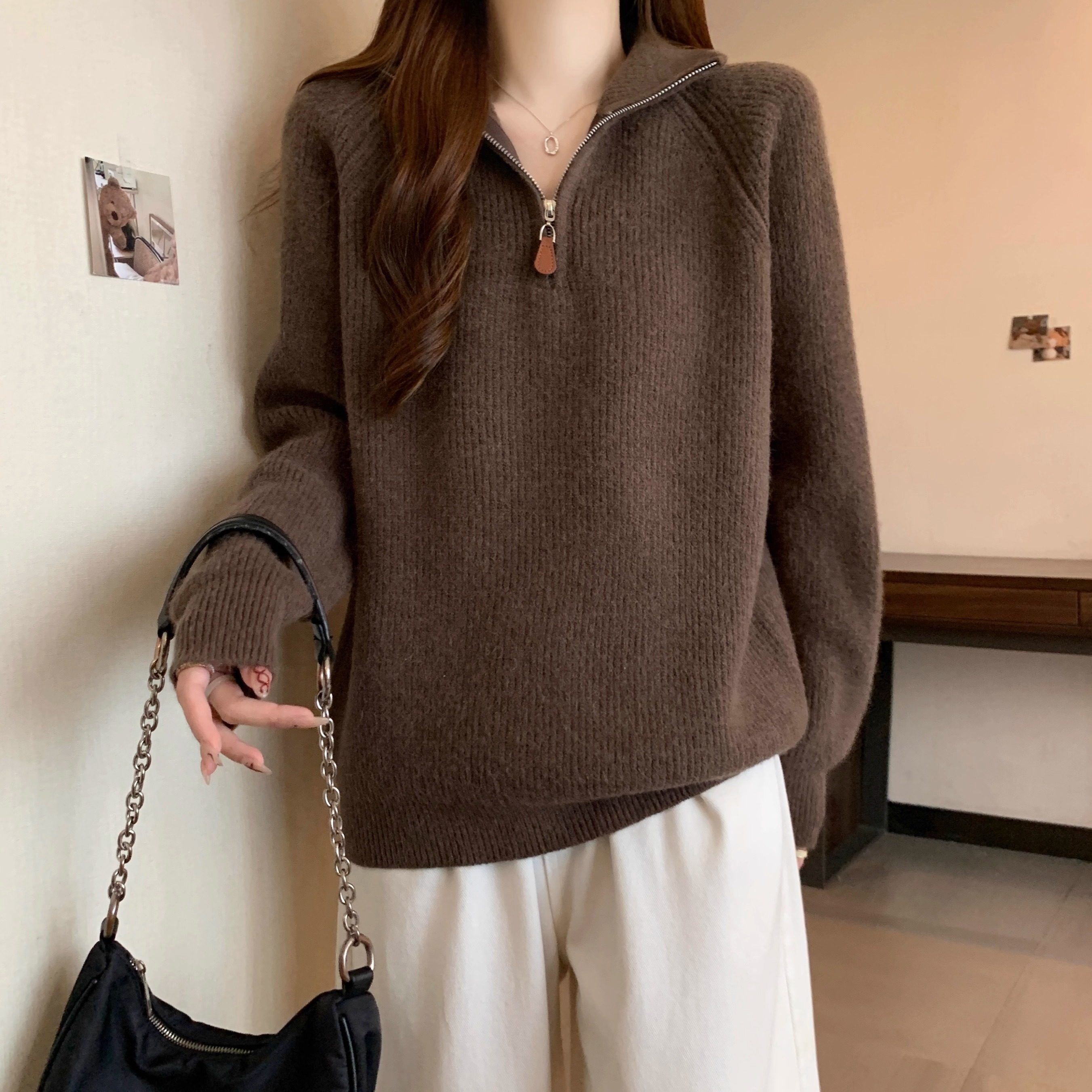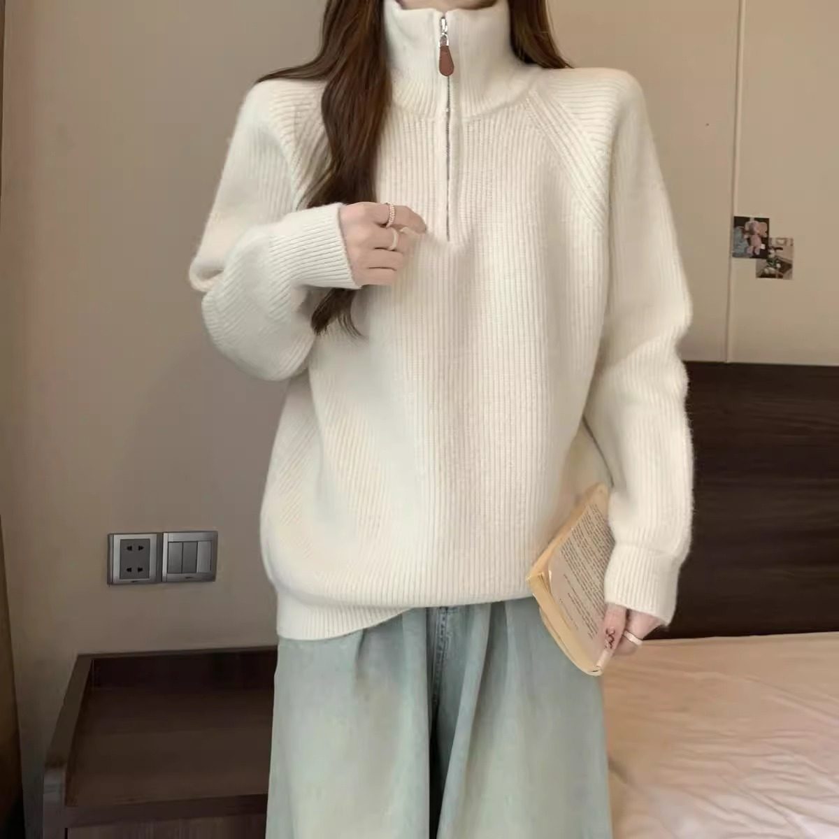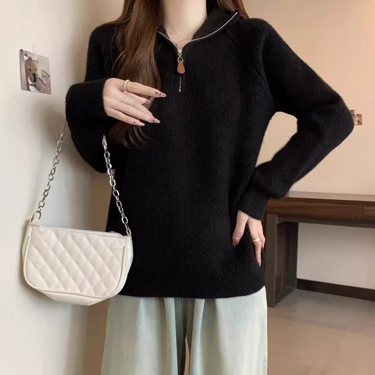 秋冬半开领女士针织衫韩版百搭立领宽松慵懒风毛衣加厚针织打底衫