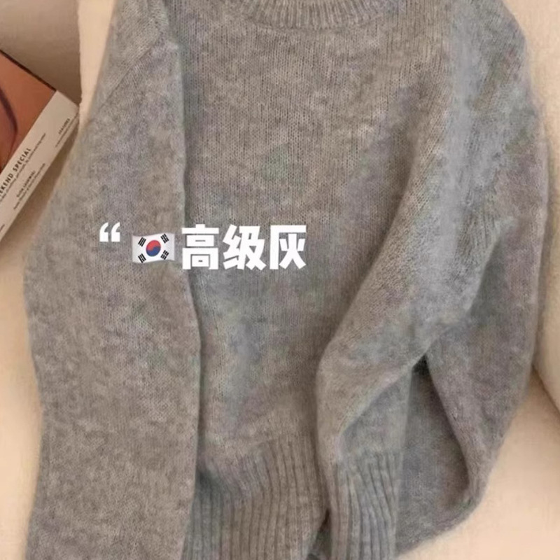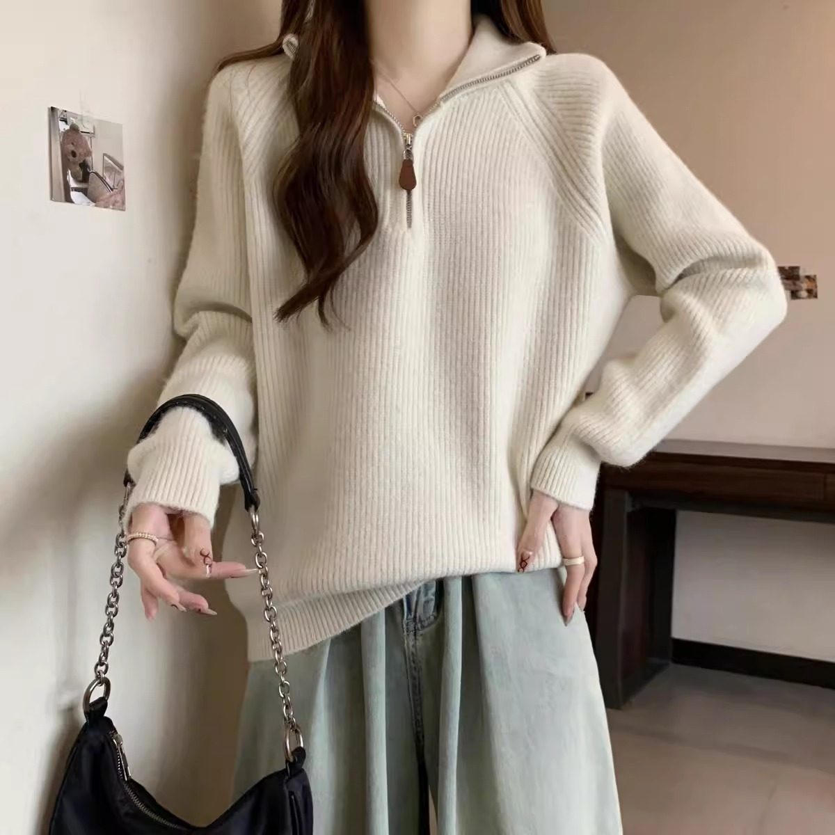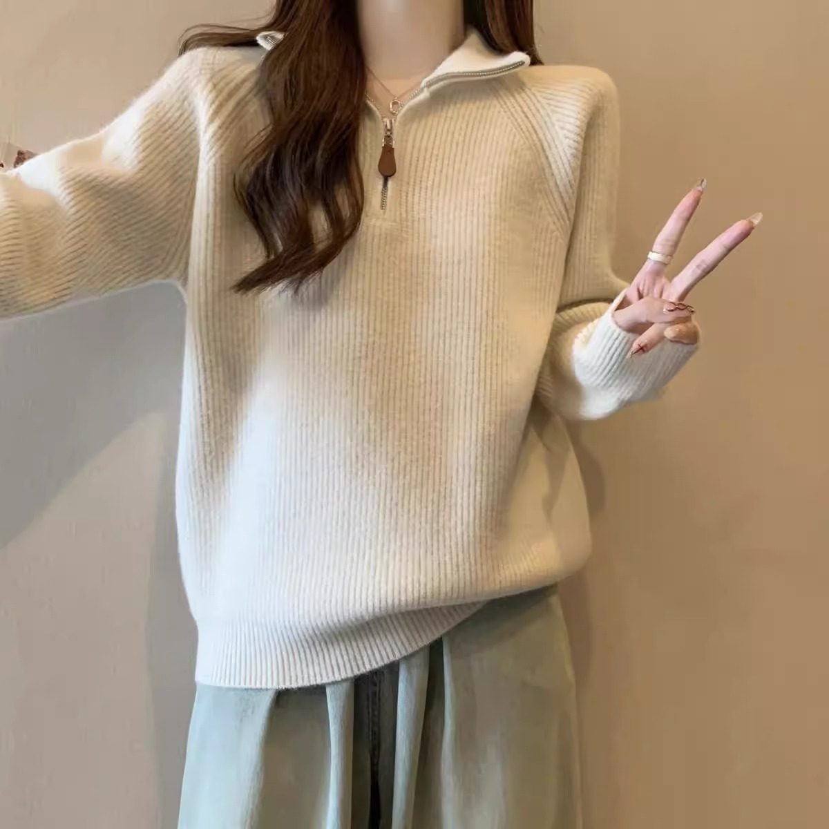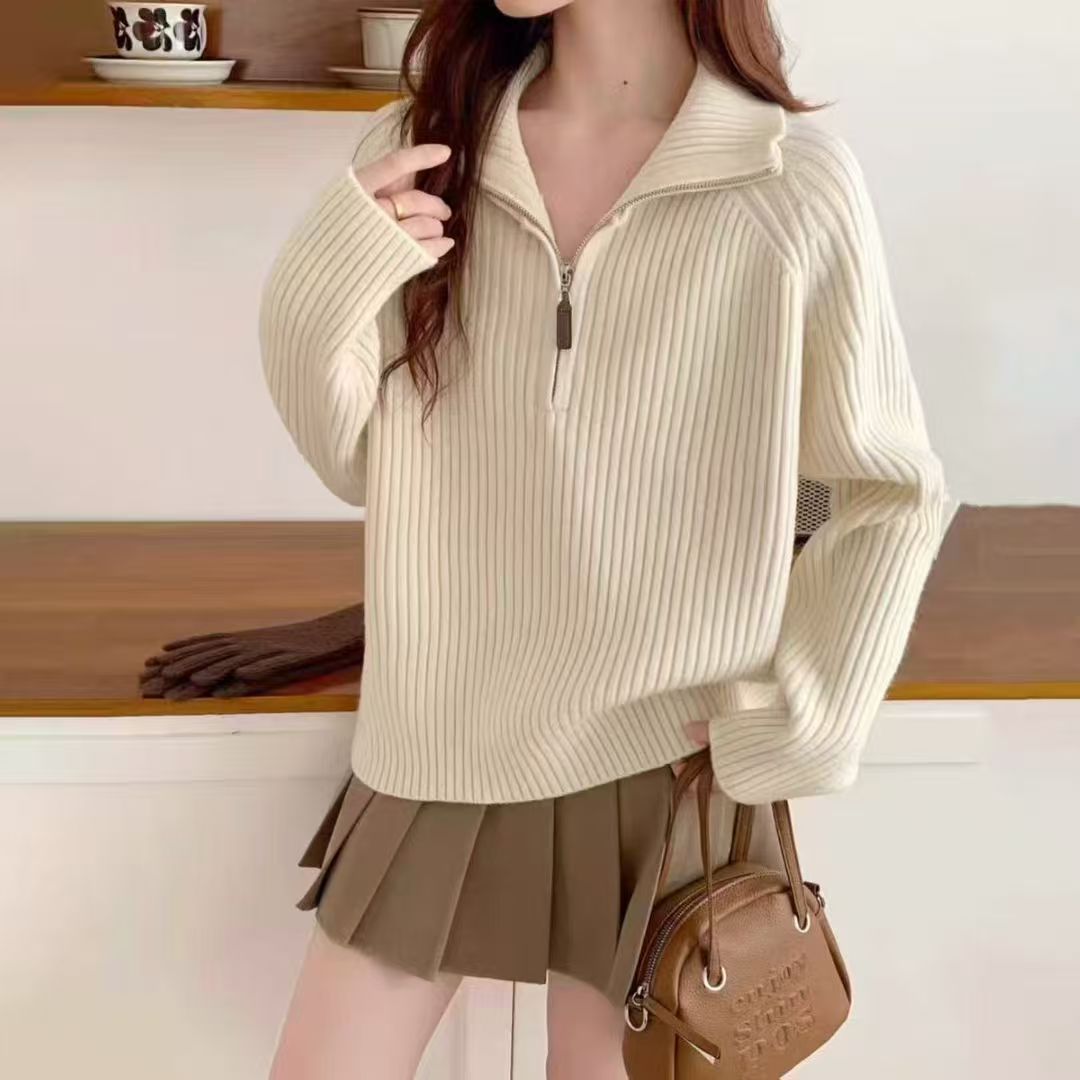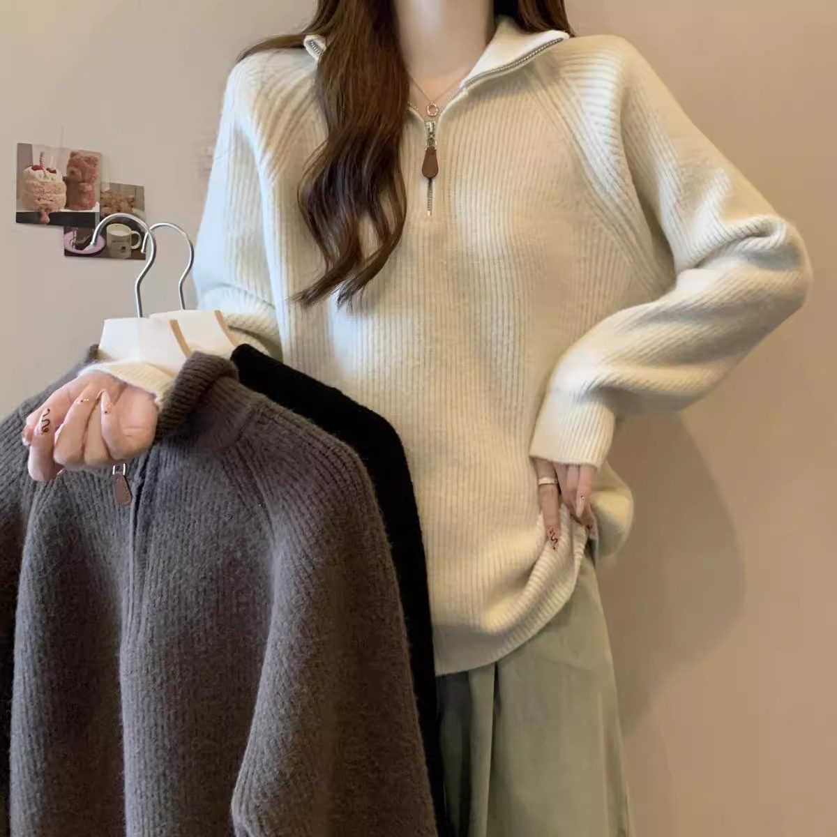 秋冬半开领女士针织衫韩版百搭立领宽松慵懒风毛衣加厚针织打底衫