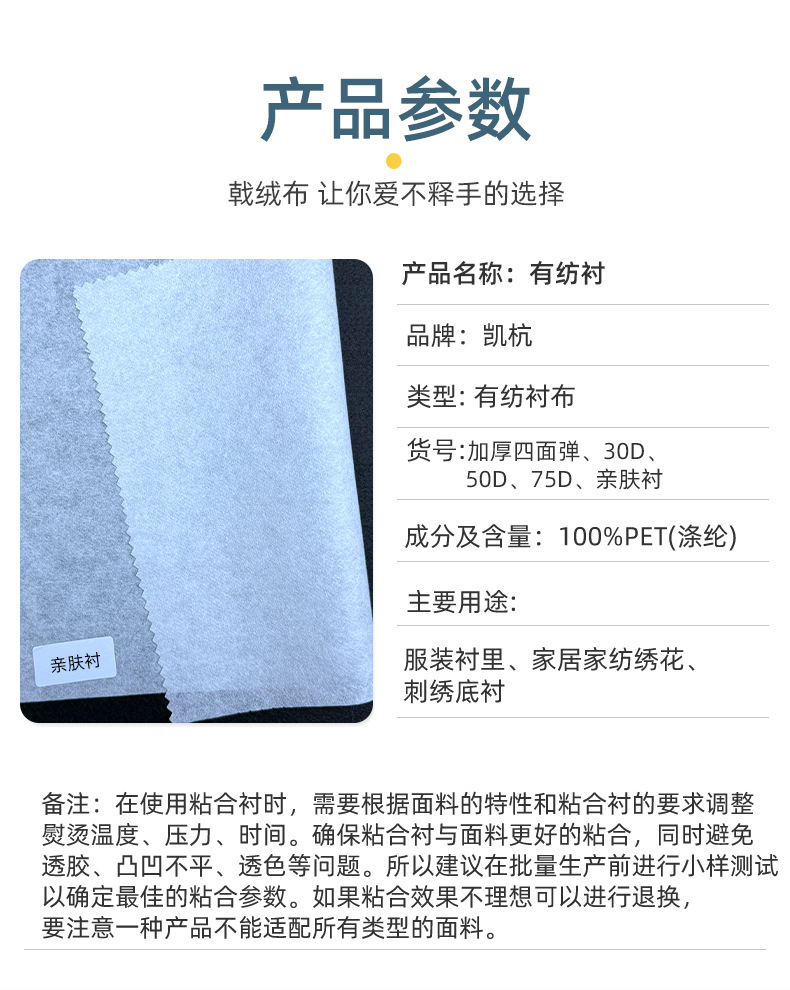 颜色 30D白色(48寸*100码),30D白色 (60寸*100码 ),50D白色(48寸*100码),50D白色(60寸*100码 ),75D白色(48寸*100码),75D白色(60寸*100码 ),亲肤衬(150cm*100码),加厚四面弹(150cm*100码)