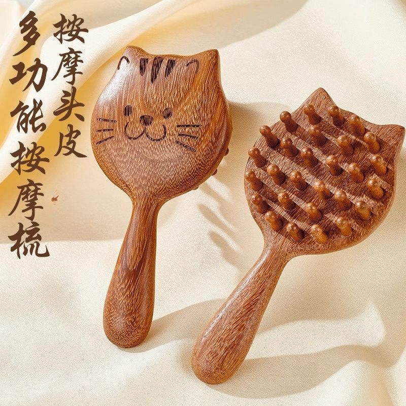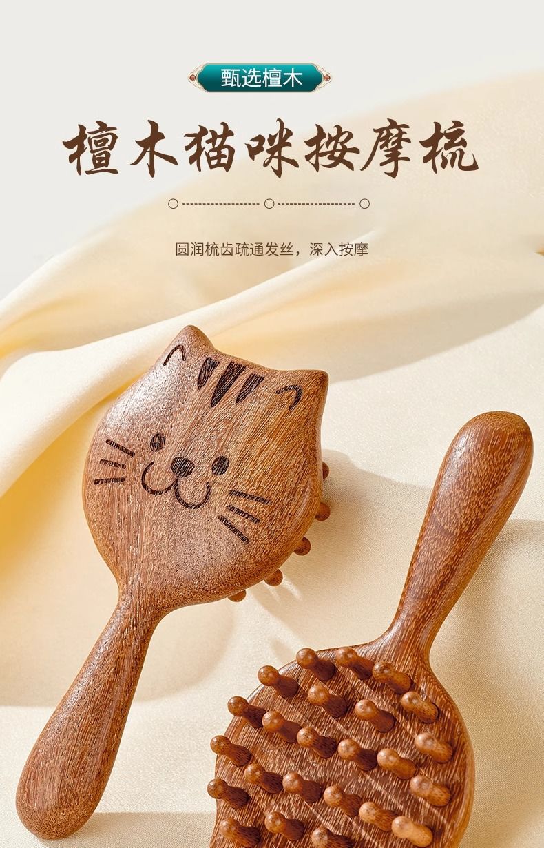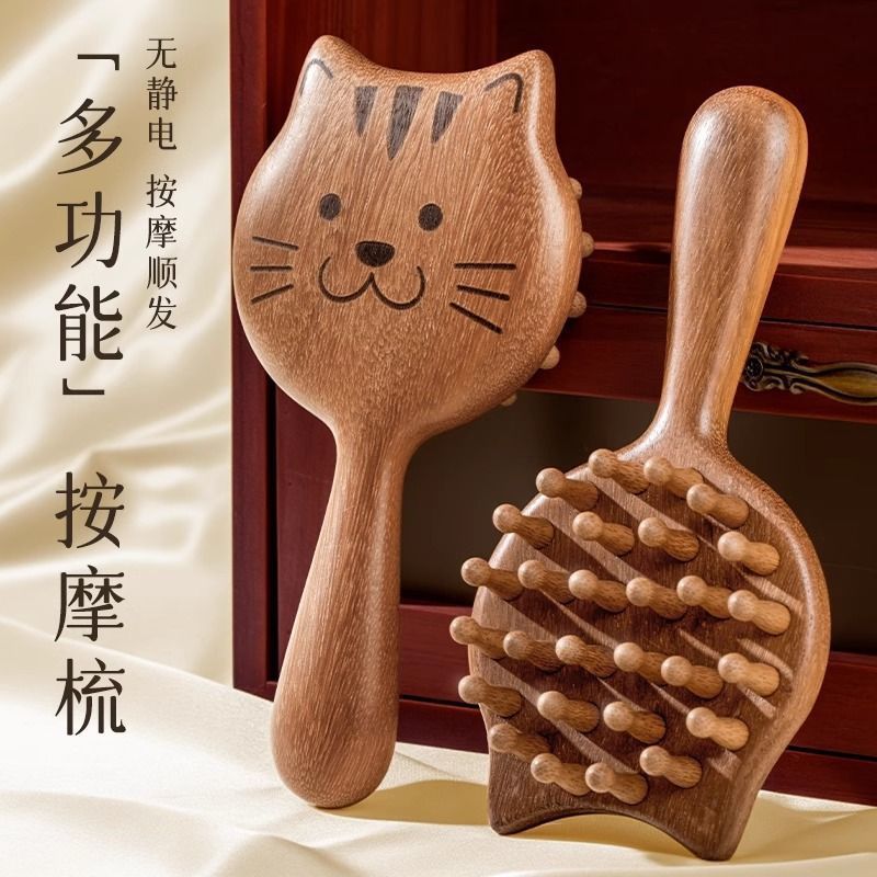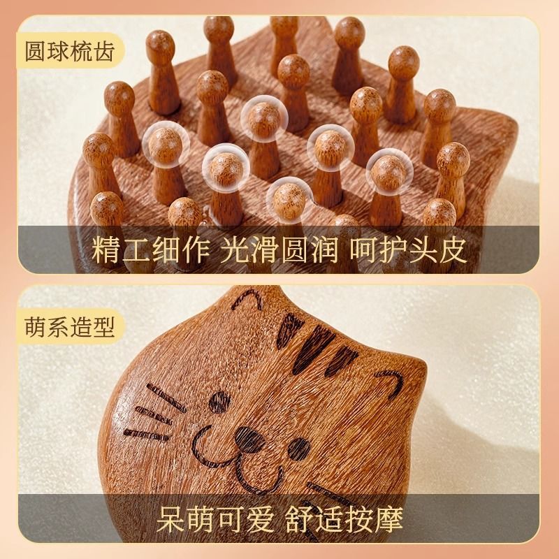 小猫钉钉梳头皮按摩梳头部经络梳檀木按摩梳子小猫插齿梳粗齿宽齿