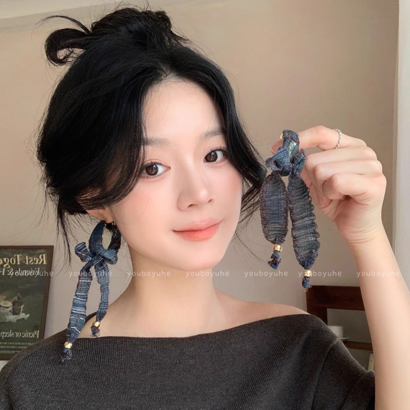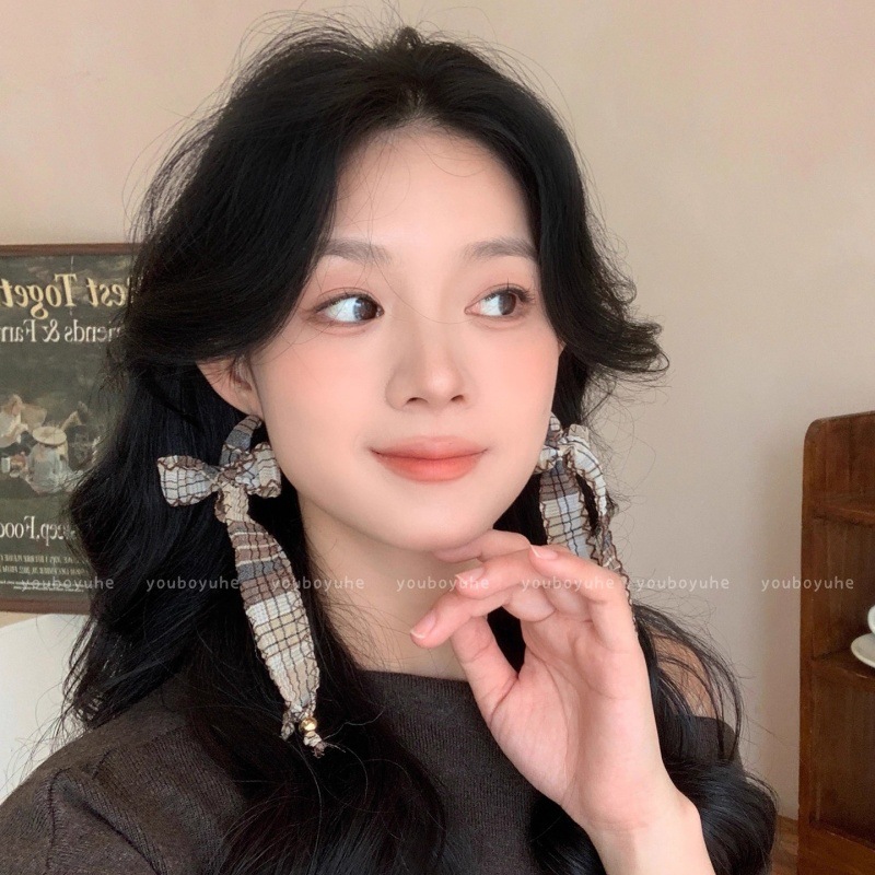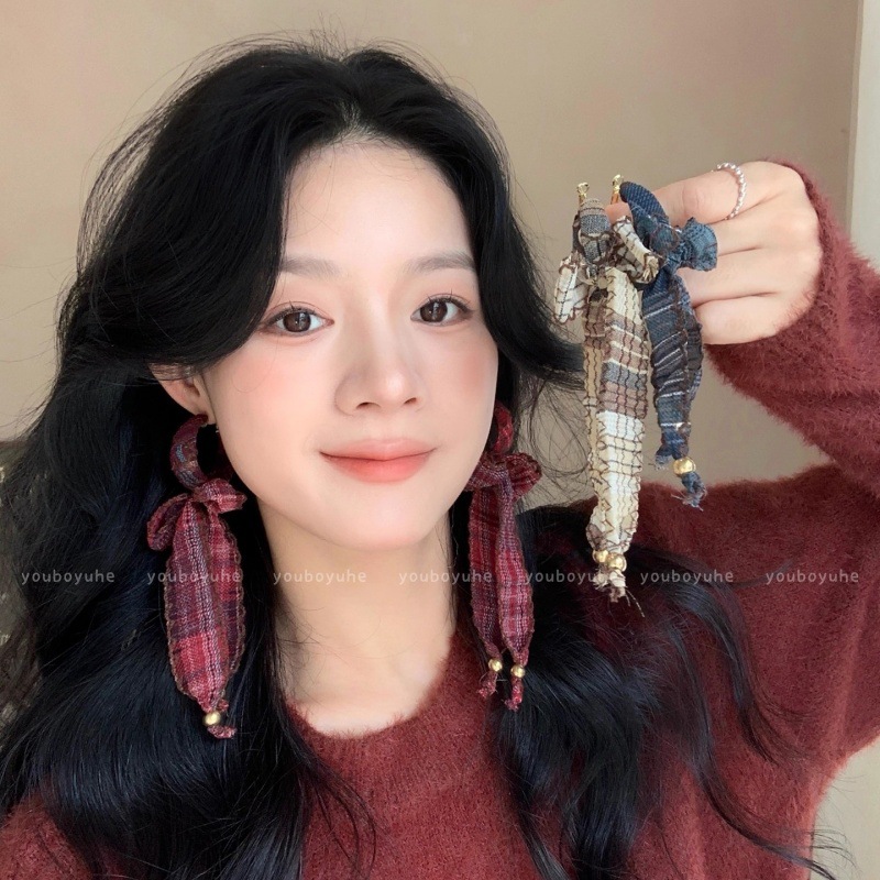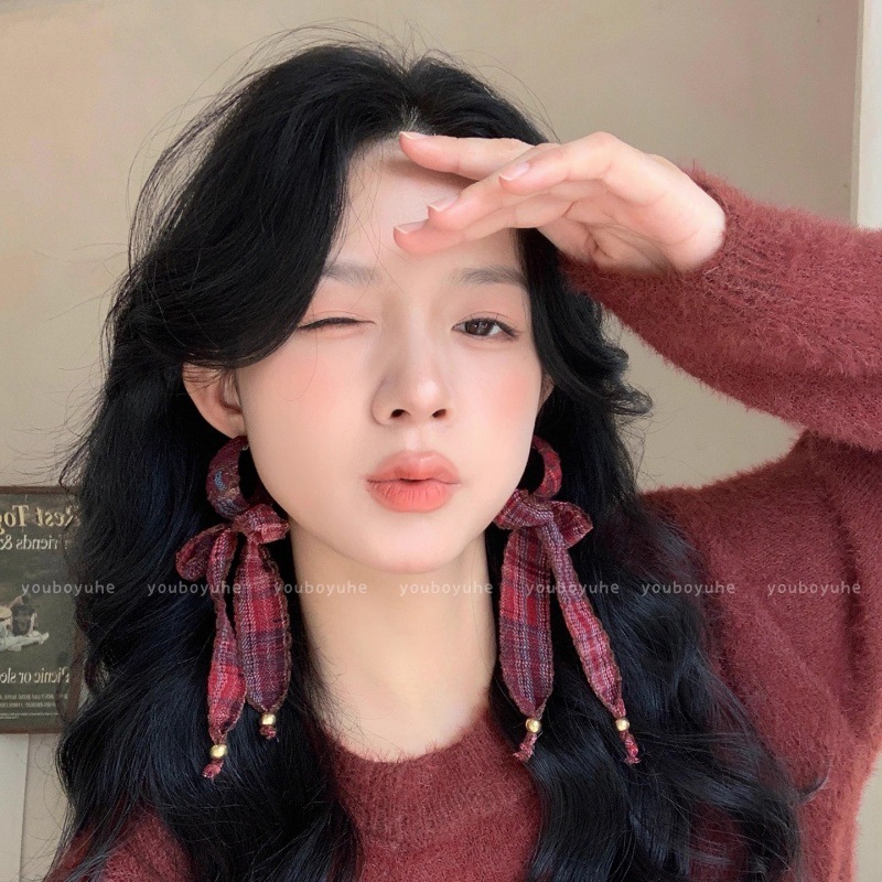 红色格纹蝴蝶结飘带耳环女高级感独特设计2026耳圈夸张圈圈耳饰品