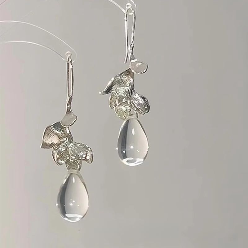 「氷晶露」冷淡風破砕感ガラス水滴気質ペンダント小衆デザイン花葉耳飾り