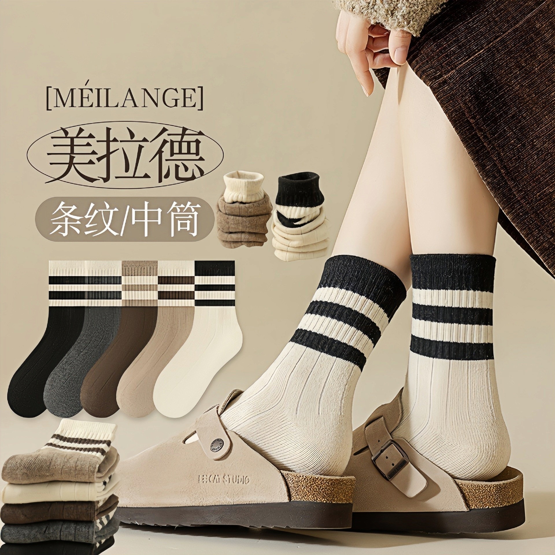 秋冬袜子女复古风条纹中筒袜新款百搭显瘦堆堆袜休闲防滑长筒袜子