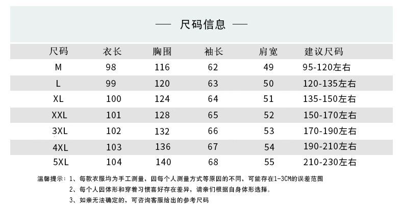 尺码 170/M【建议110斤左右】,175/L【建议130斤左右】,180/XL【建议150斤左右】,185/XXL【建议170斤左右】,190/3XL【建议190斤左右】,195/4XL【建议210斤左右】,200/5XL【建议220斤左右】