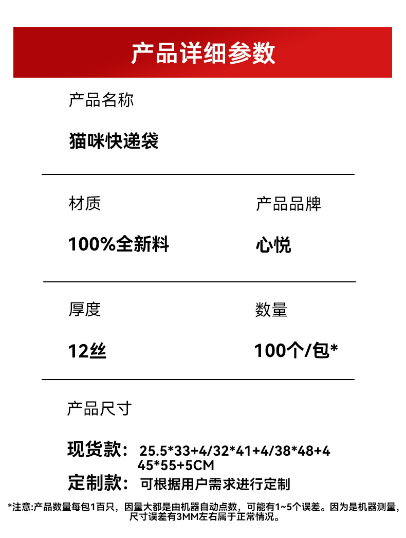 规格型号 猫咪【100个/包】;25.5*33+4cm,猫咪【100个/包】;32*40+4cm,猫咪【100个/包】;38*48+4cm,猫咪【100个/包】;45*55+4cm