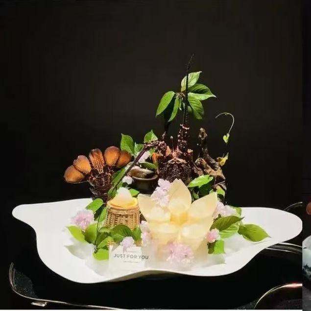 皿を並べて剣の葉を飾って身を刺すサーモンの海鮮の姿を作って皿式の品を飾って草花をまねて長い水草を飾ります。