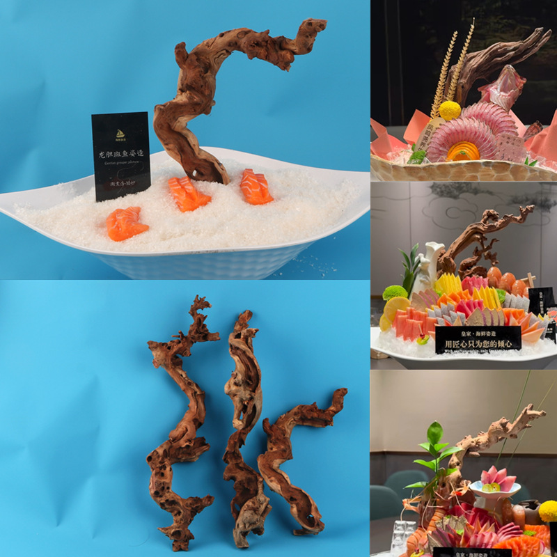 ホテルレストランの高級魚介類の刺身プレート装飾、サーモンの装飾、木の根の形