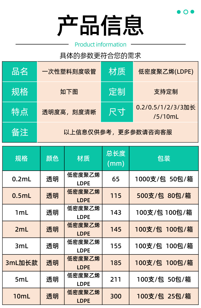 容量 0.2ml(1000支/包),0.5ml(500支/包),0.5ml吸管(85MM)500支/包,1ml(0.65g 100支/包),1ml加厚0.9g(100支/包)*,2ml(100支/包),2ml加厚0.8g(100支/包),3ml(100支/包),3ml加厚1.05g(100支/包),3ml加厚1.2g(100支/包),3ml加厚1.3g(100支/包),3ml加长1.2g(100支/包),3ml加长1.3g(100支/包),3ml加长1.4g(100支/包),5ml(100支/包),5ml加厚2.2g(100支/包),10ml(100支/包),10ml加厚4.2g(100支/包)