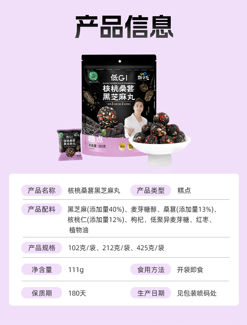 包装规格 核桃桑葚芝麻丸59.5g*7粒,DHA核桃芝麻丸59.5g*7粒,低GI五黑芝麻丸59.5g*7粒
