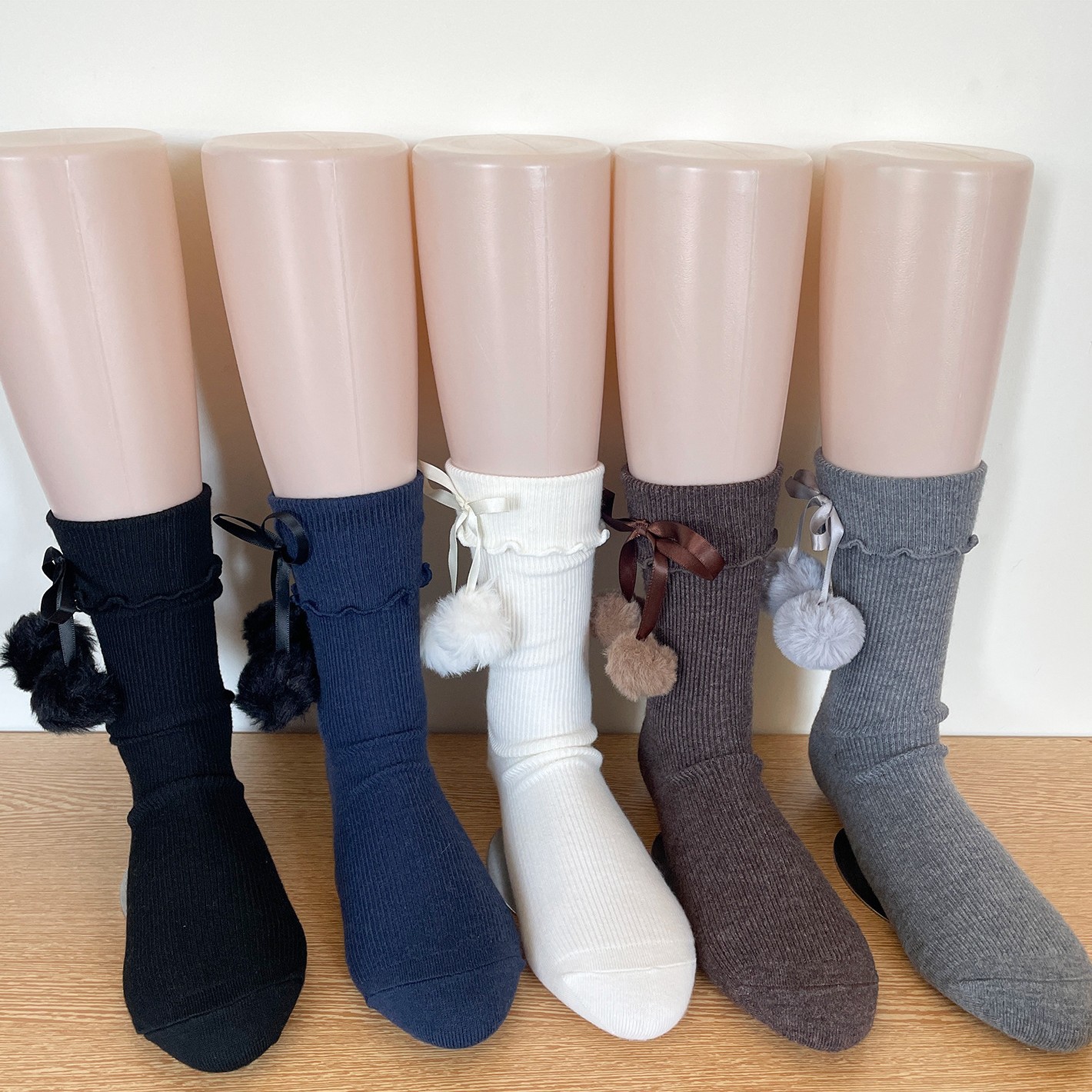 2025秋冬新款甜美毛绒蝴蝶结毛球中筒袜韩版翻边堆堆袜木耳边袜子
