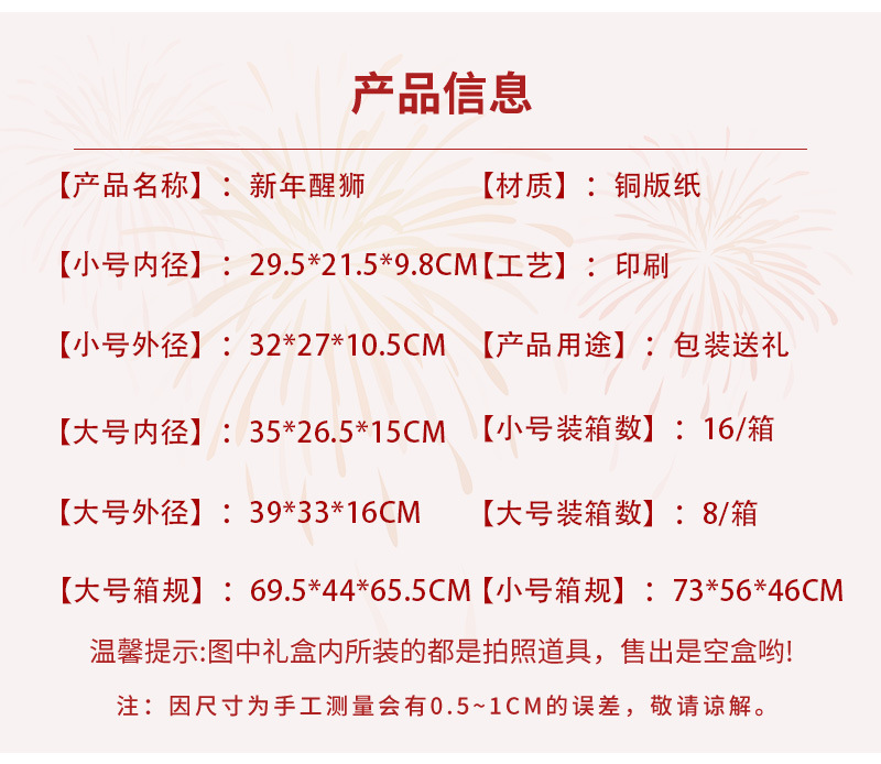 规格型号 新年醒狮礼盒;小号内径:29.5*21.5*9.8CM,新年醒狮礼盒;大号内径:35*26.5*15CM