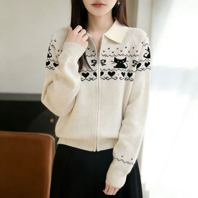 徐艺洋同款猫咪提花开衫秋冬新款保暖舒适打底衫翻领纯欲慵懒毛衣