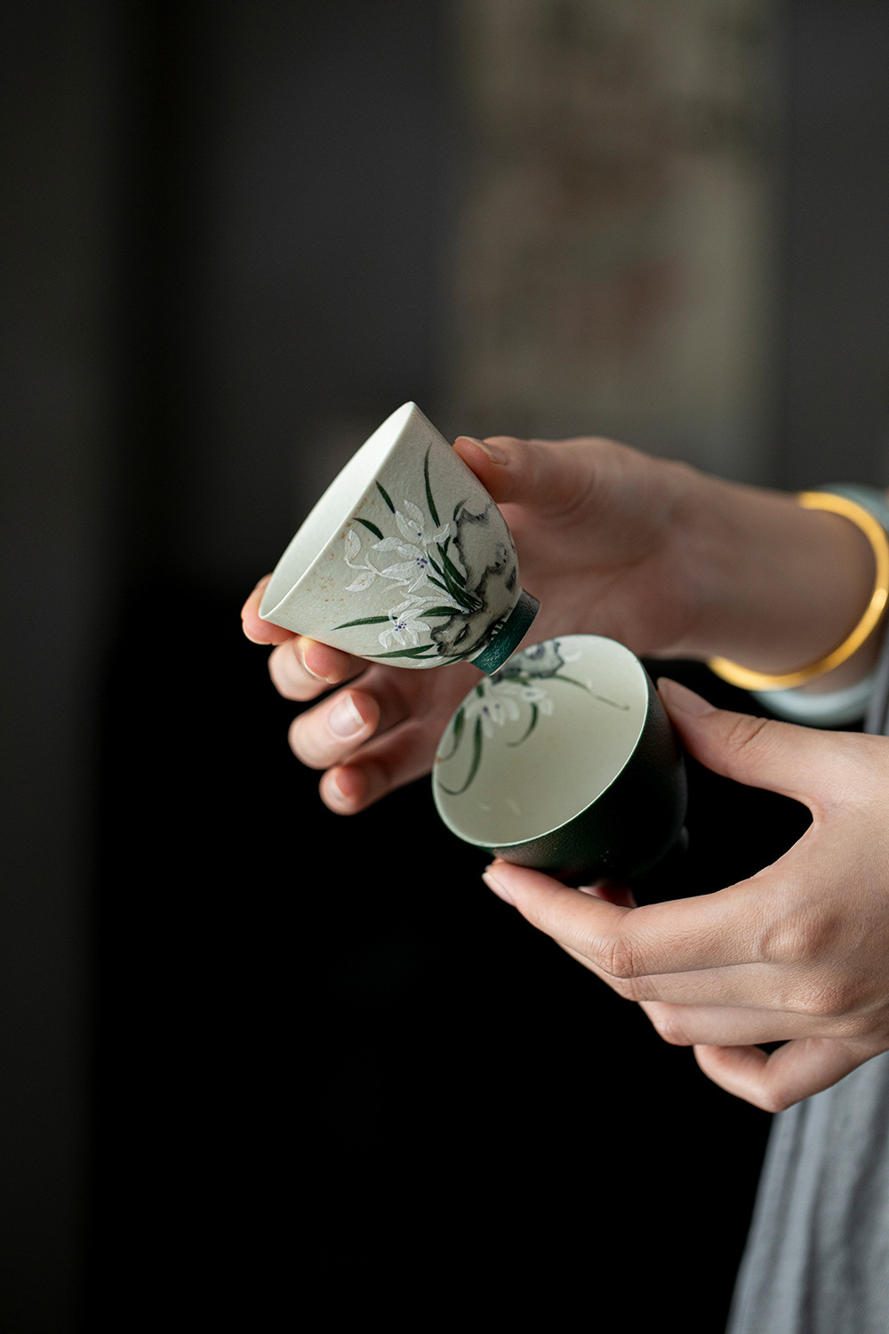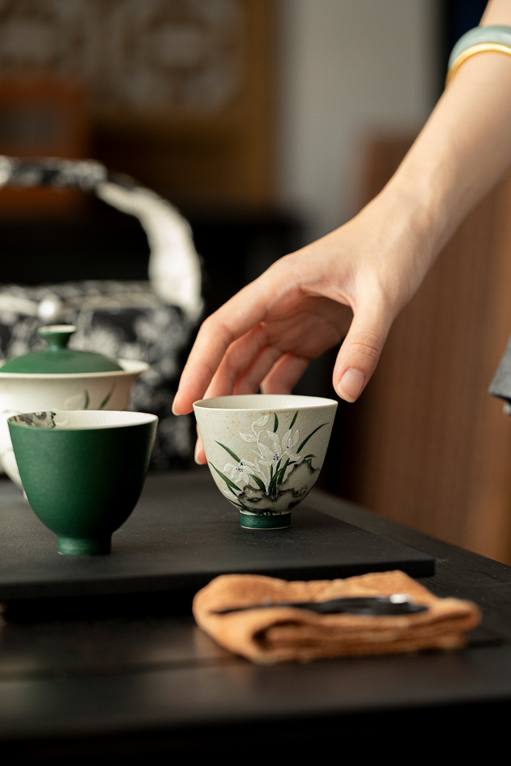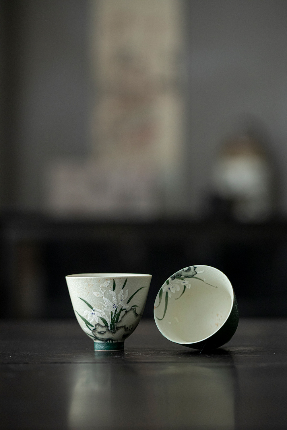 颜色分类 火石红-空谷幽兰-望月茶杯,墨绿内绘-空谷幽兰-望月茶杯