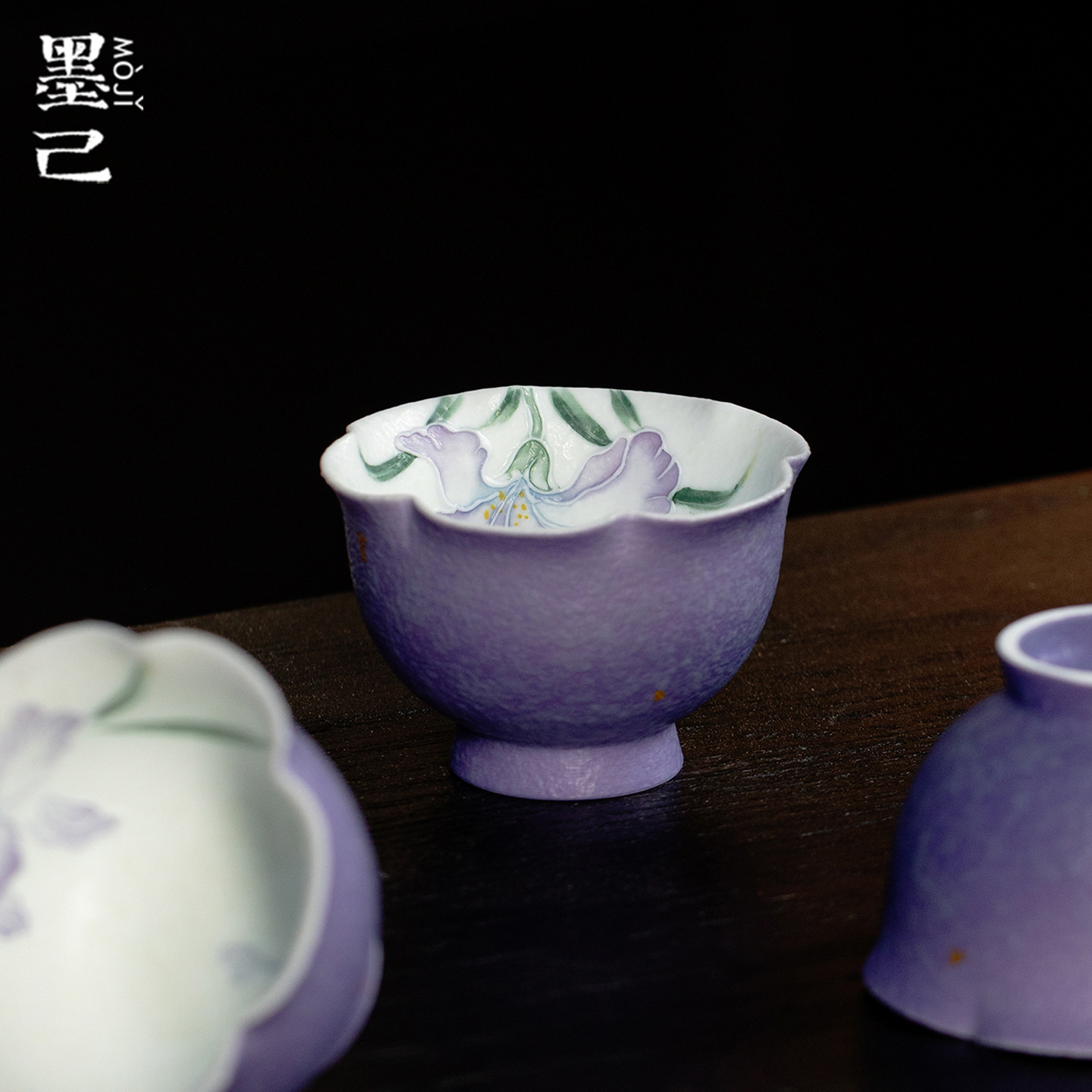 墨己火石红暮云紫手绘鸢尾花仿古陶瓷家用品茗杯功夫茶具花口茶杯