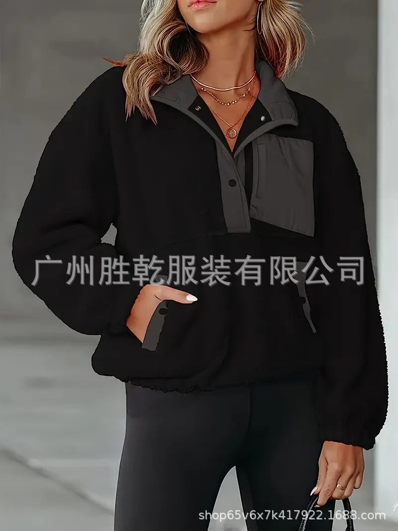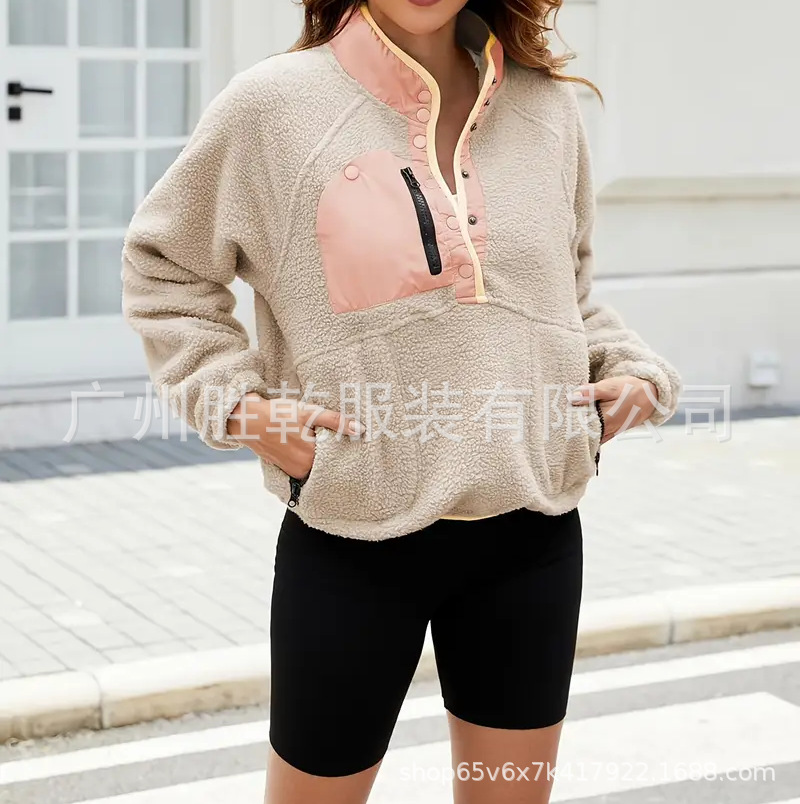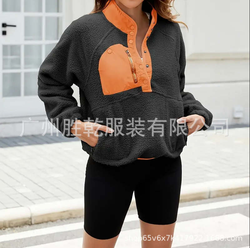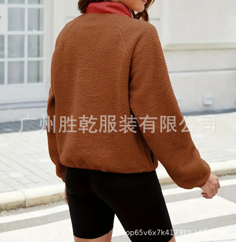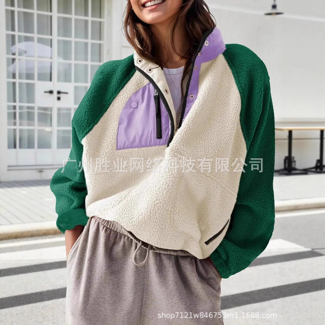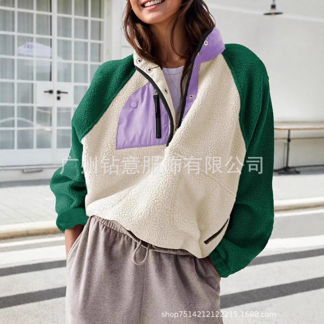 2025欧美跨境外贸毛绒套头短款宽松冬季上衣立领设计拼色拉链口袋
