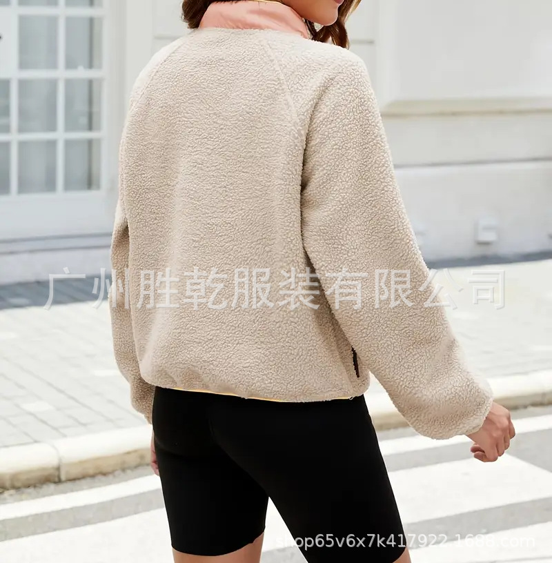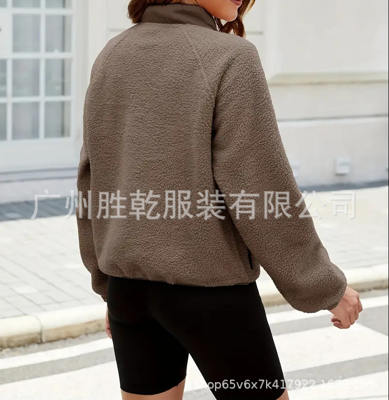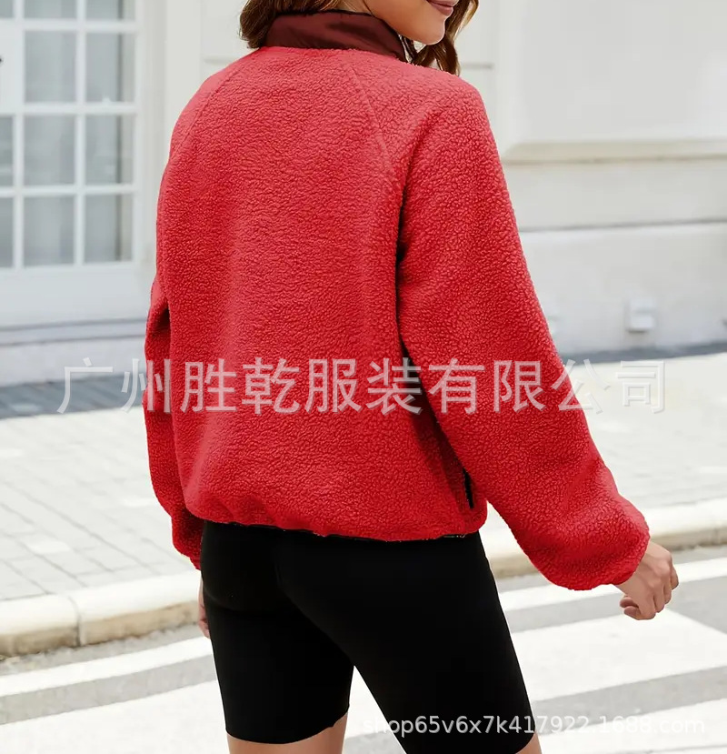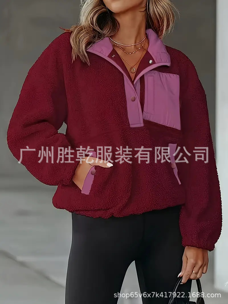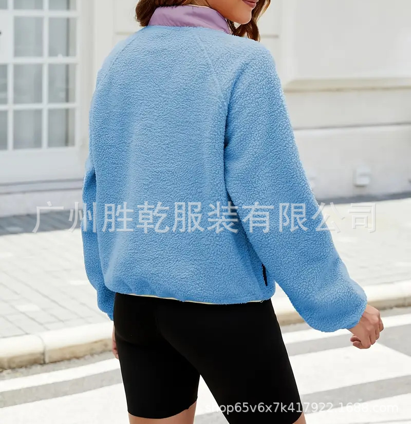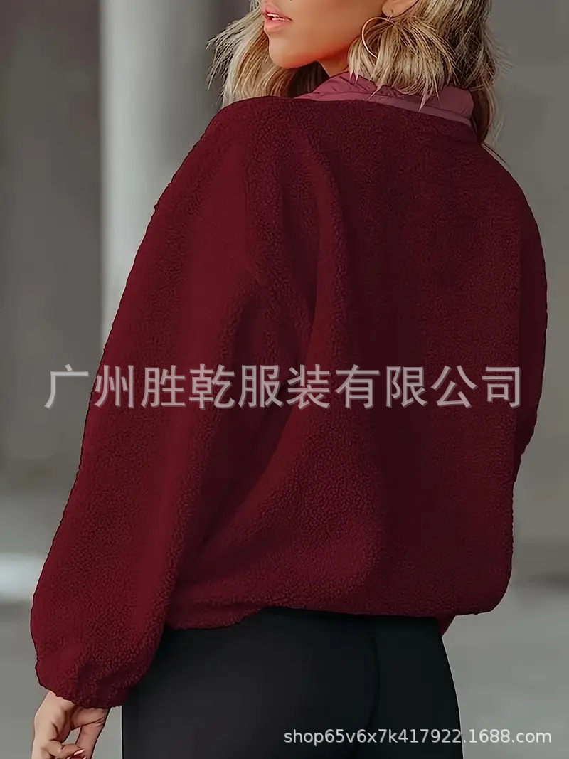 2025欧美跨境外贸毛绒套头短款宽松冬季上衣立领设计拼色拉链口袋