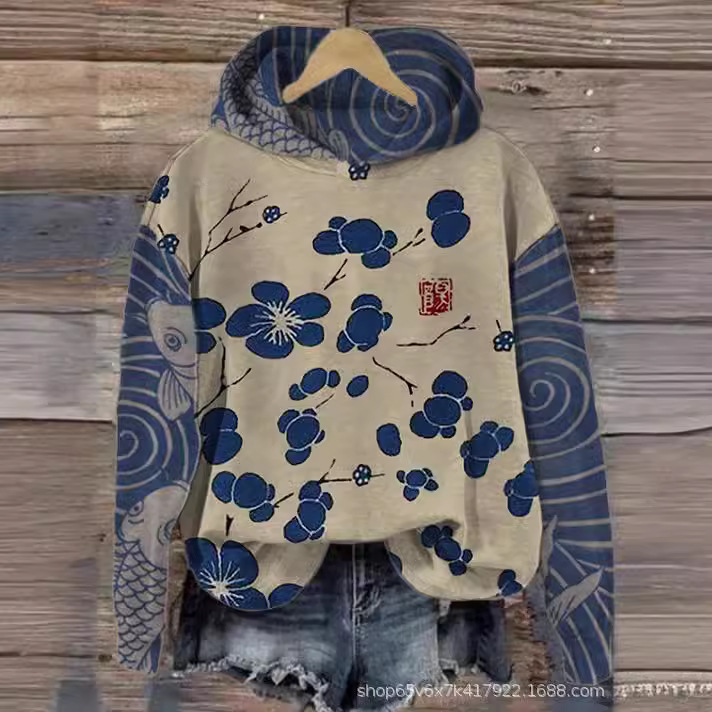 2023新型国境を越えた対外貿易欧米女装スポットアマゾン丸襟春秋長袖プリントゆるいガーディアン