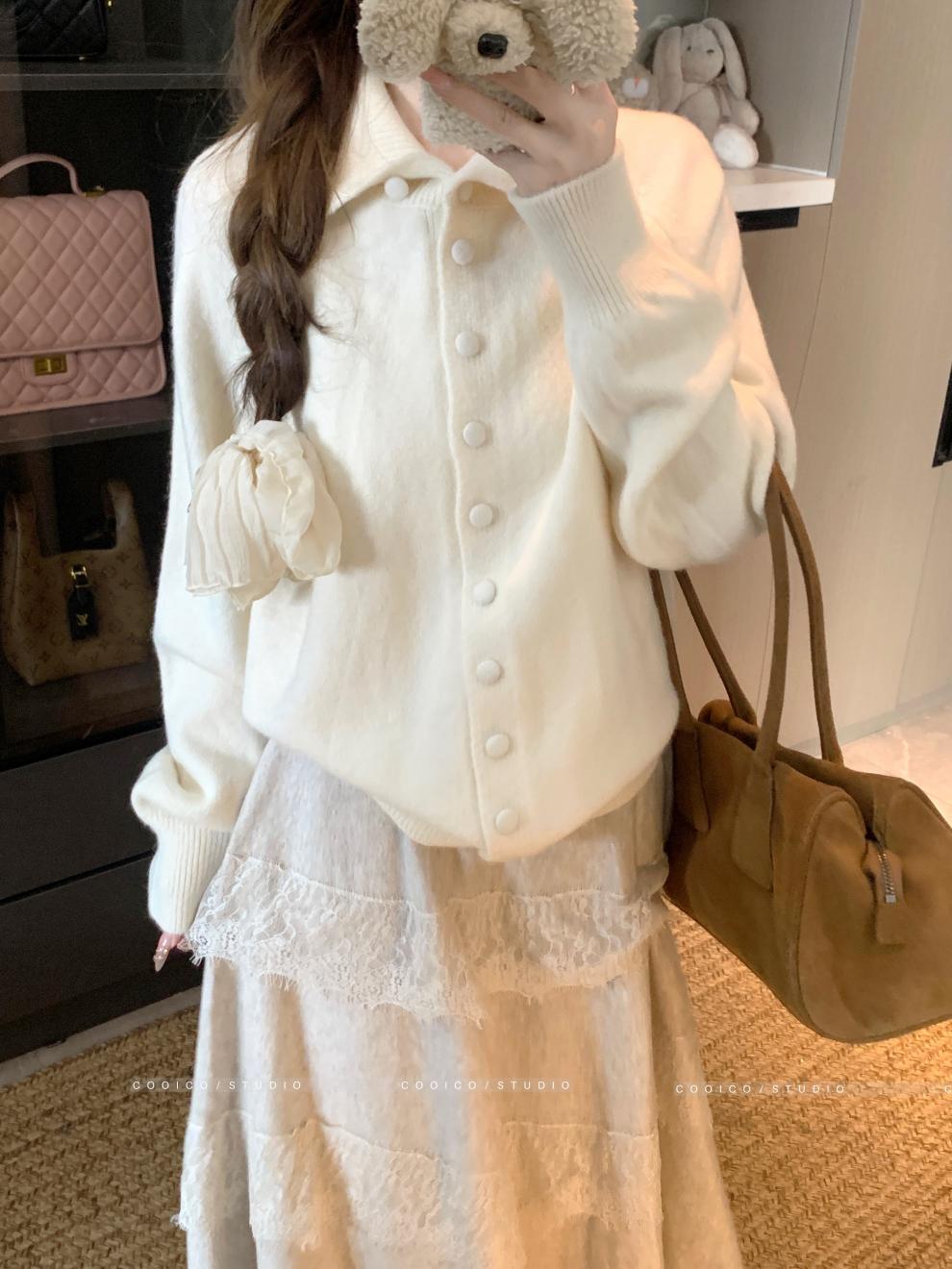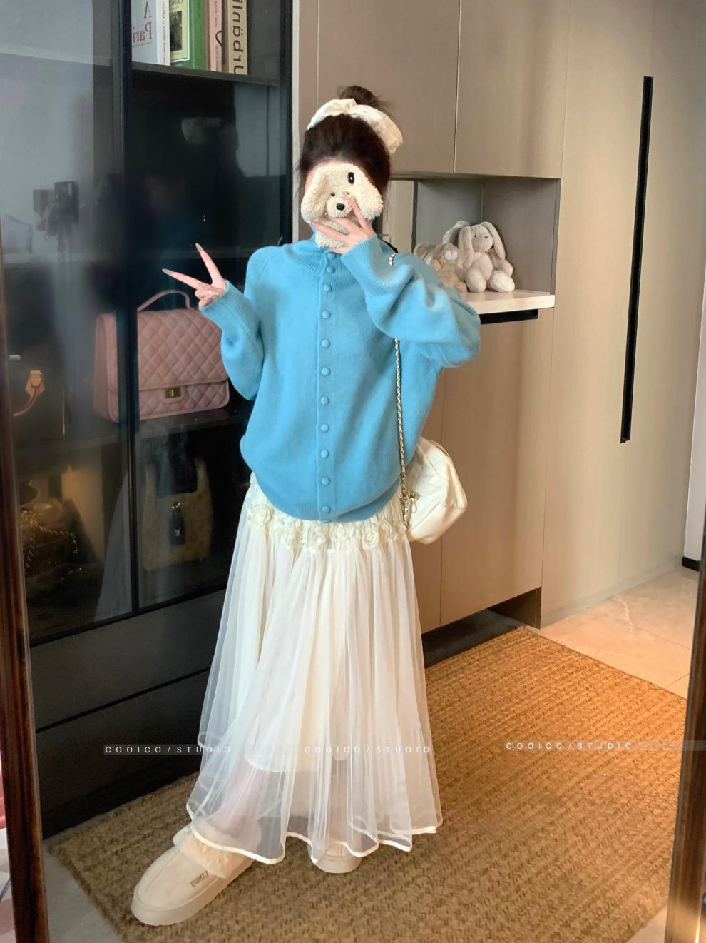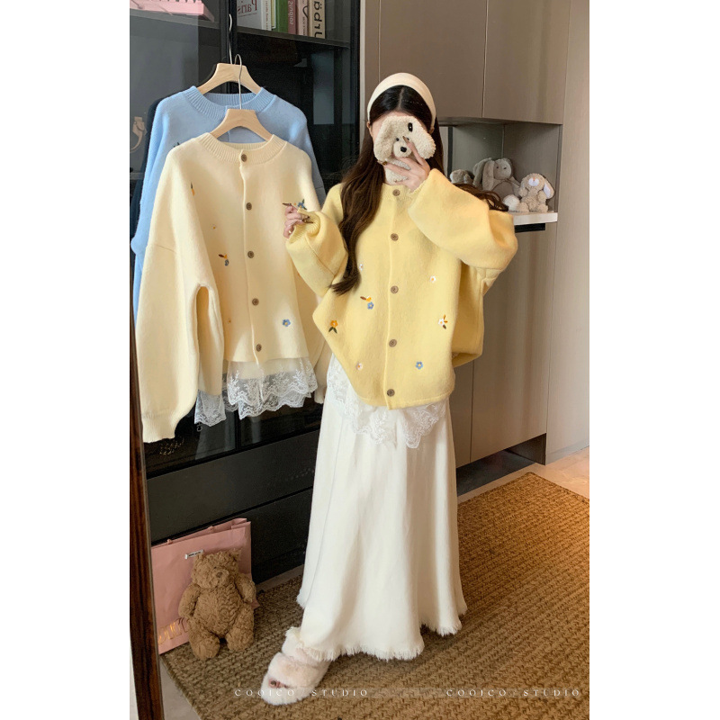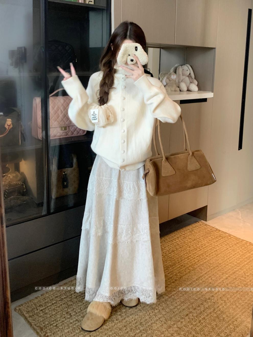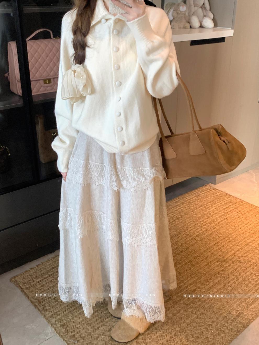 2025秋装新款大码蕾丝拼接刺绣针织开衫毛衣外套半身裙两件套