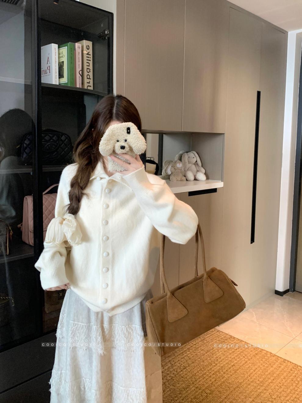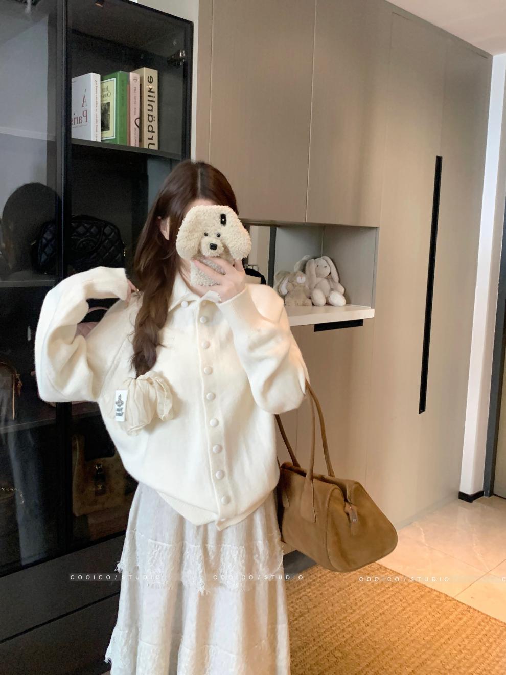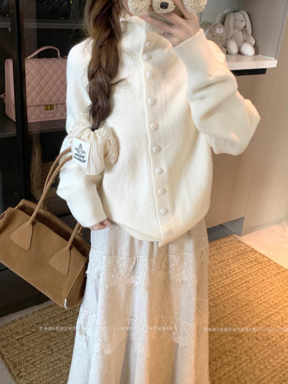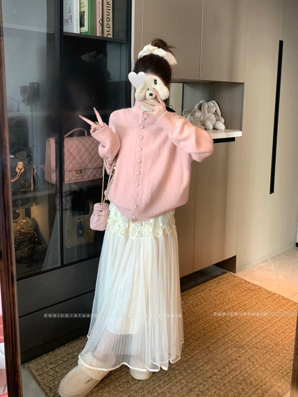 2025秋装新款大码蕾丝拼接刺绣针织开衫毛衣外套半身裙两件套