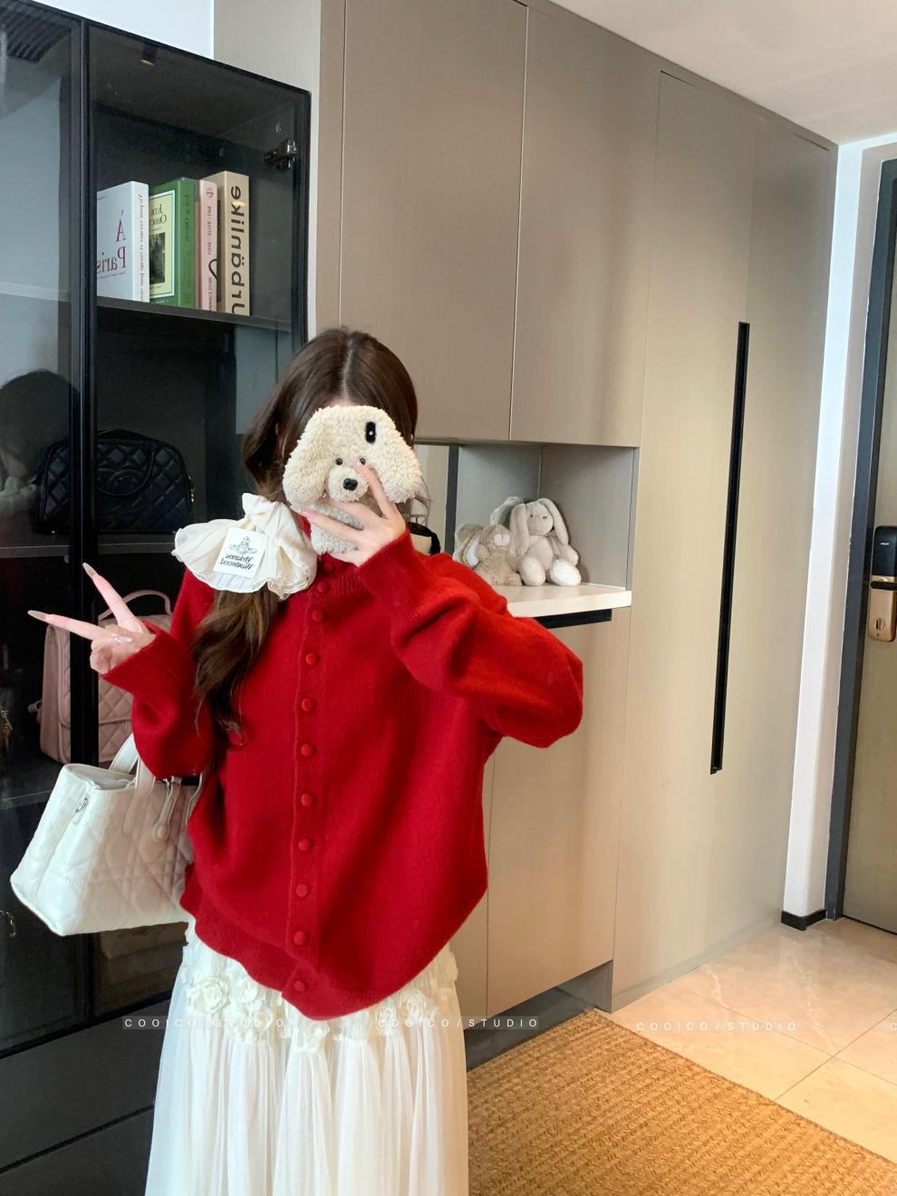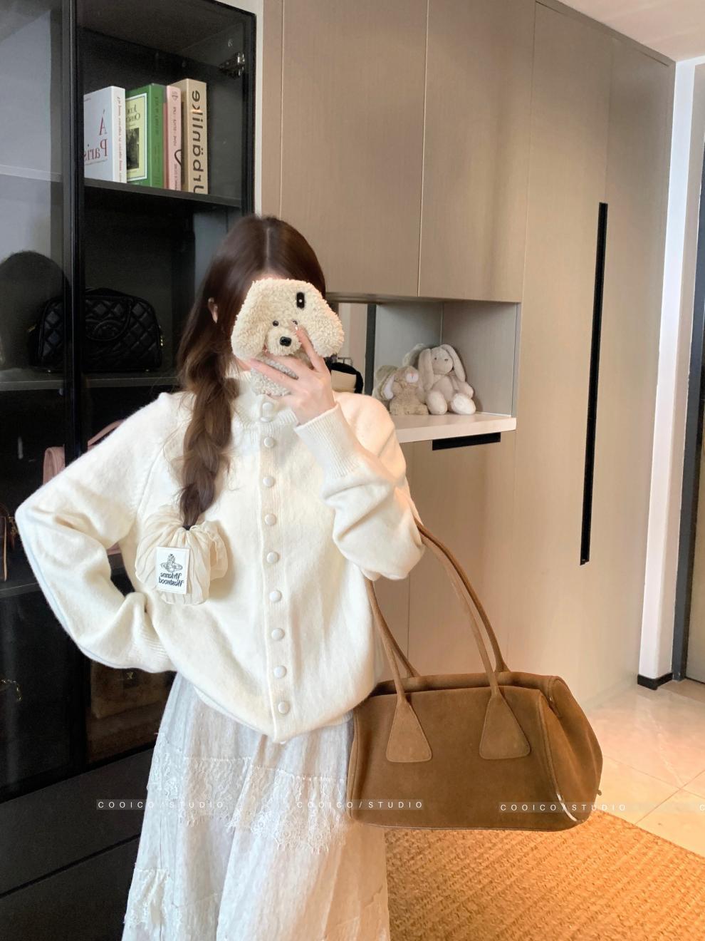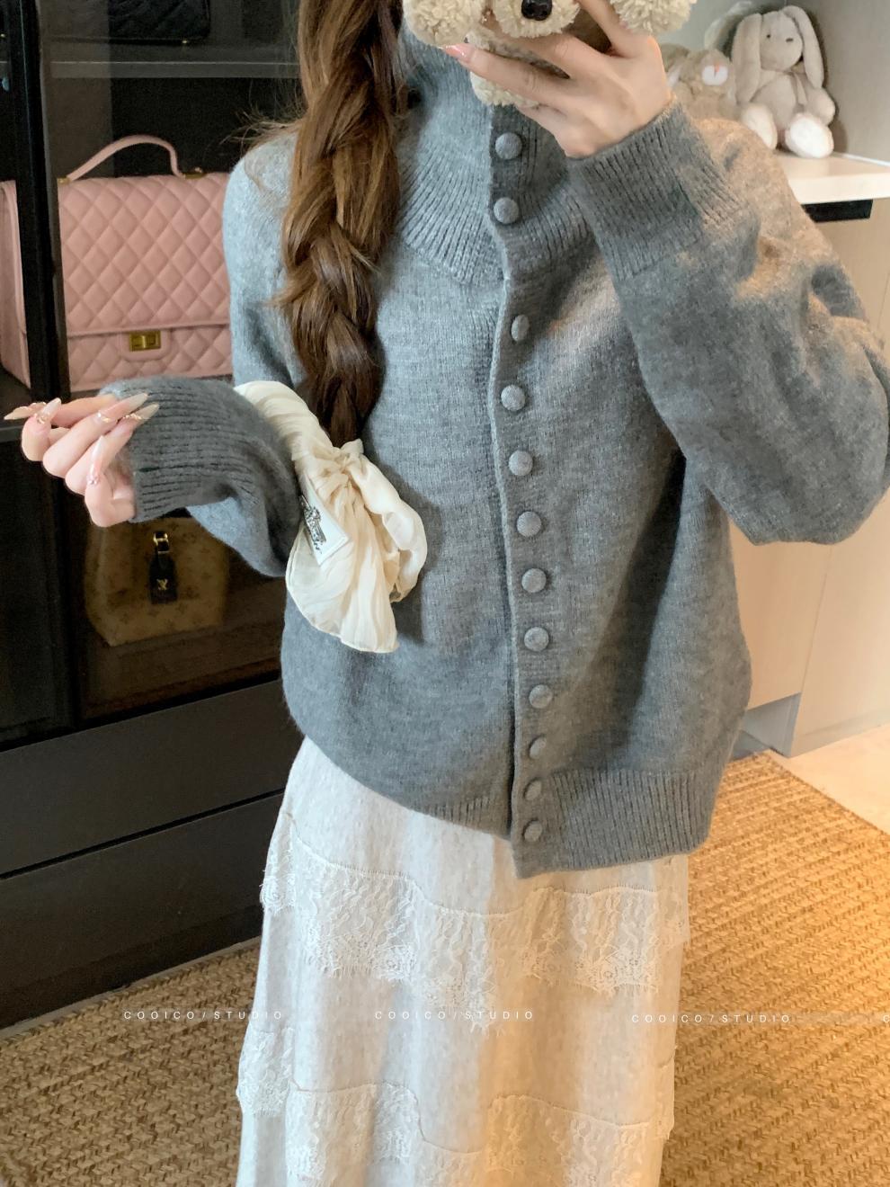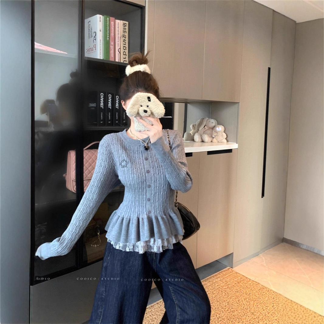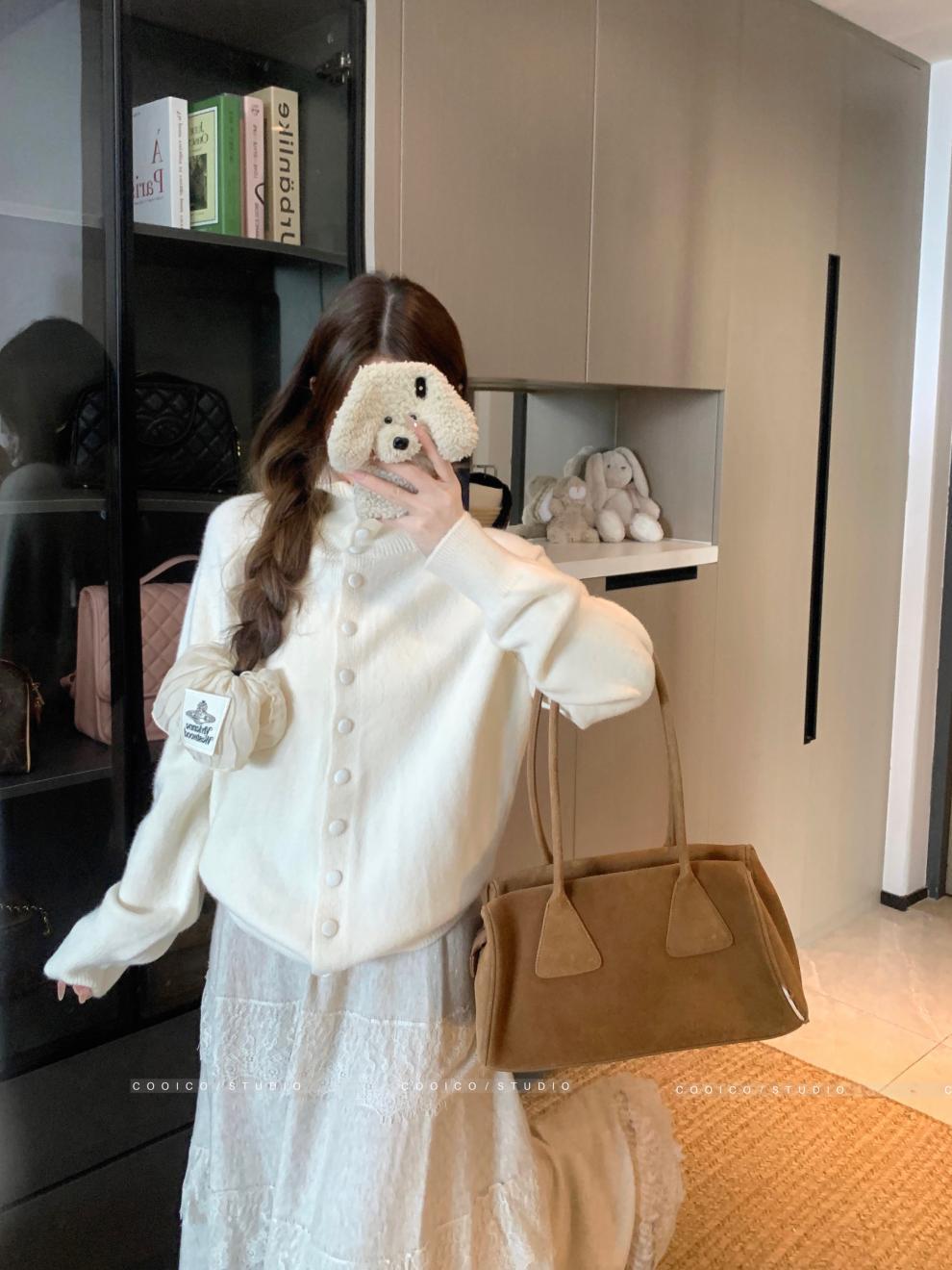 2025秋装新款大码蕾丝拼接刺绣针织开衫毛衣外套半身裙两件套