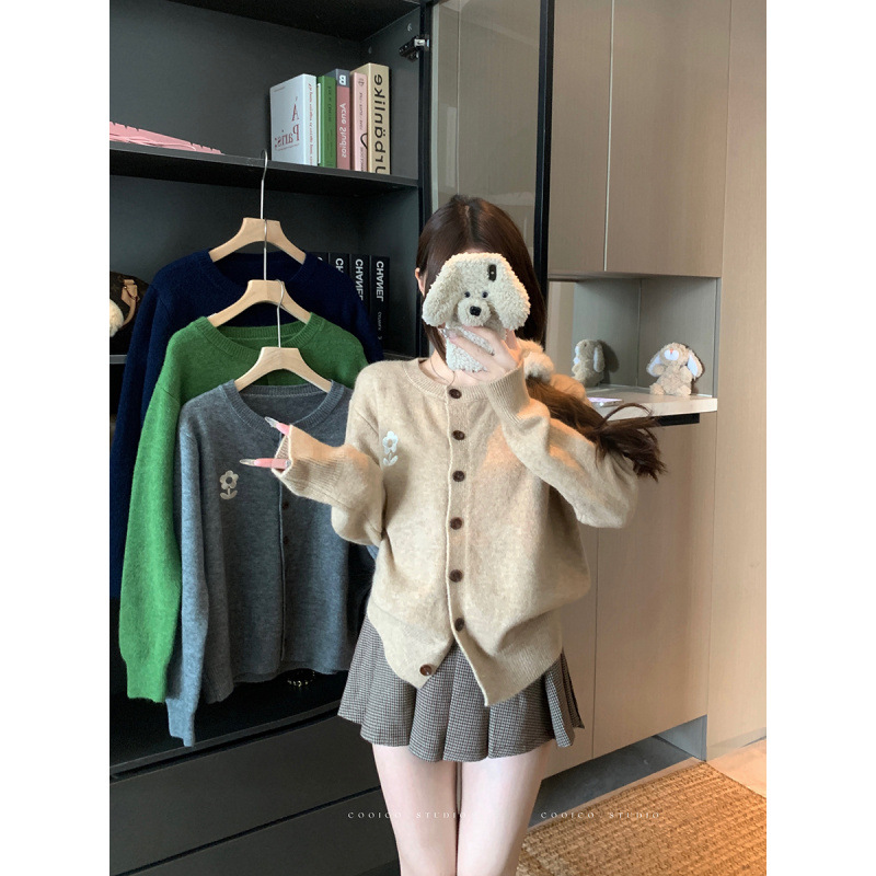 大码女装早秋花朵绣花长袖针织毛衣开衫外套女