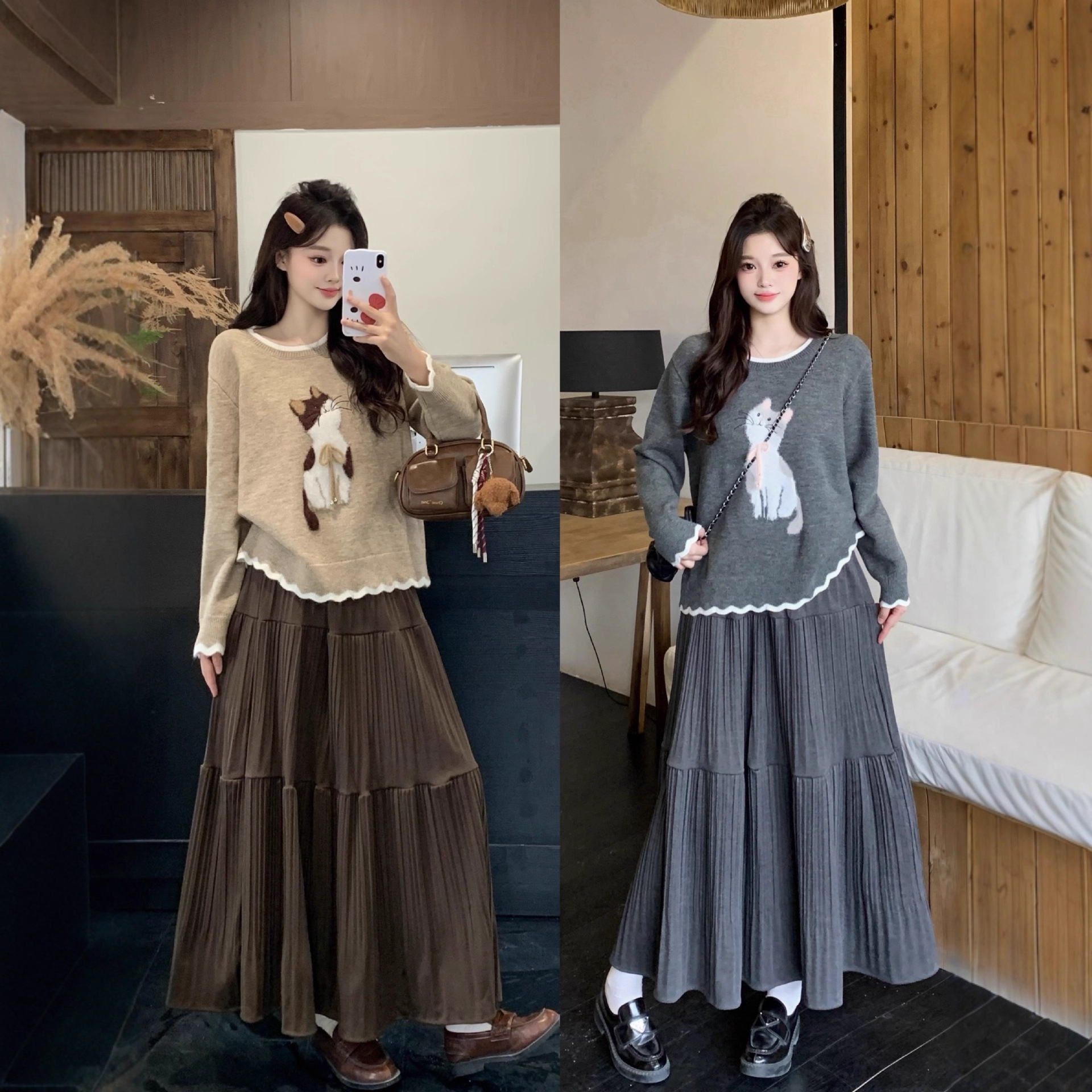 2025秋冬新款胖mm大码女甜美慵懒风绣花小猫软糯毛织长袖上衣