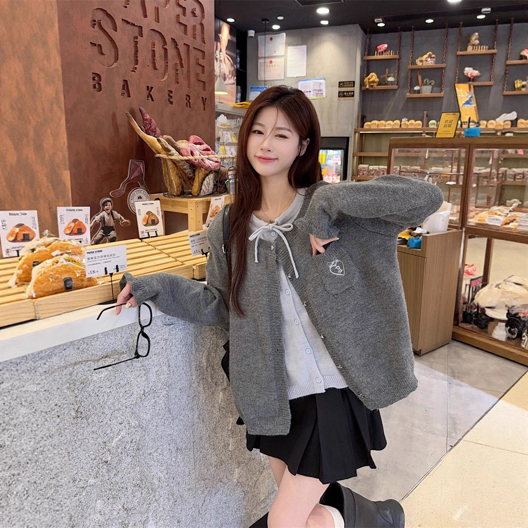 大码女装秋冬胖mm假两件针织开衫圆领宽松系带毛衣外套上衣