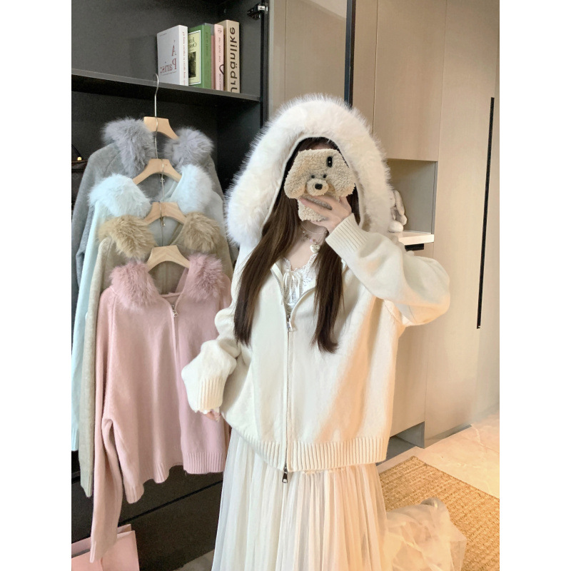大码美拉德毛领连帽毛衣外套女秋冬胖mm洋气显瘦针织开衫上衣