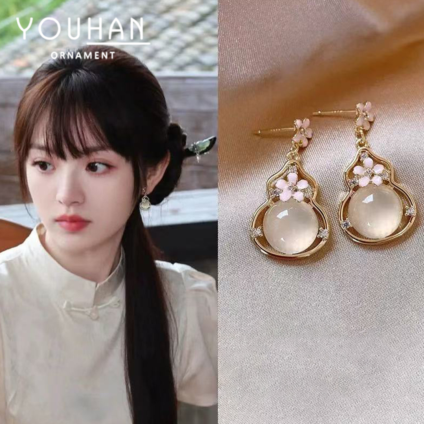 S925银针新中式粉色花朵葫芦耳环轻奢高级感耳钉简约气质百搭耳饰