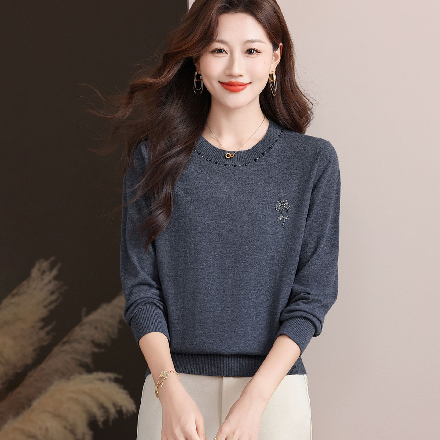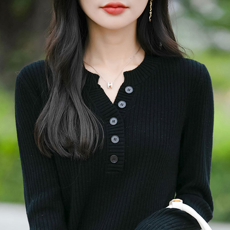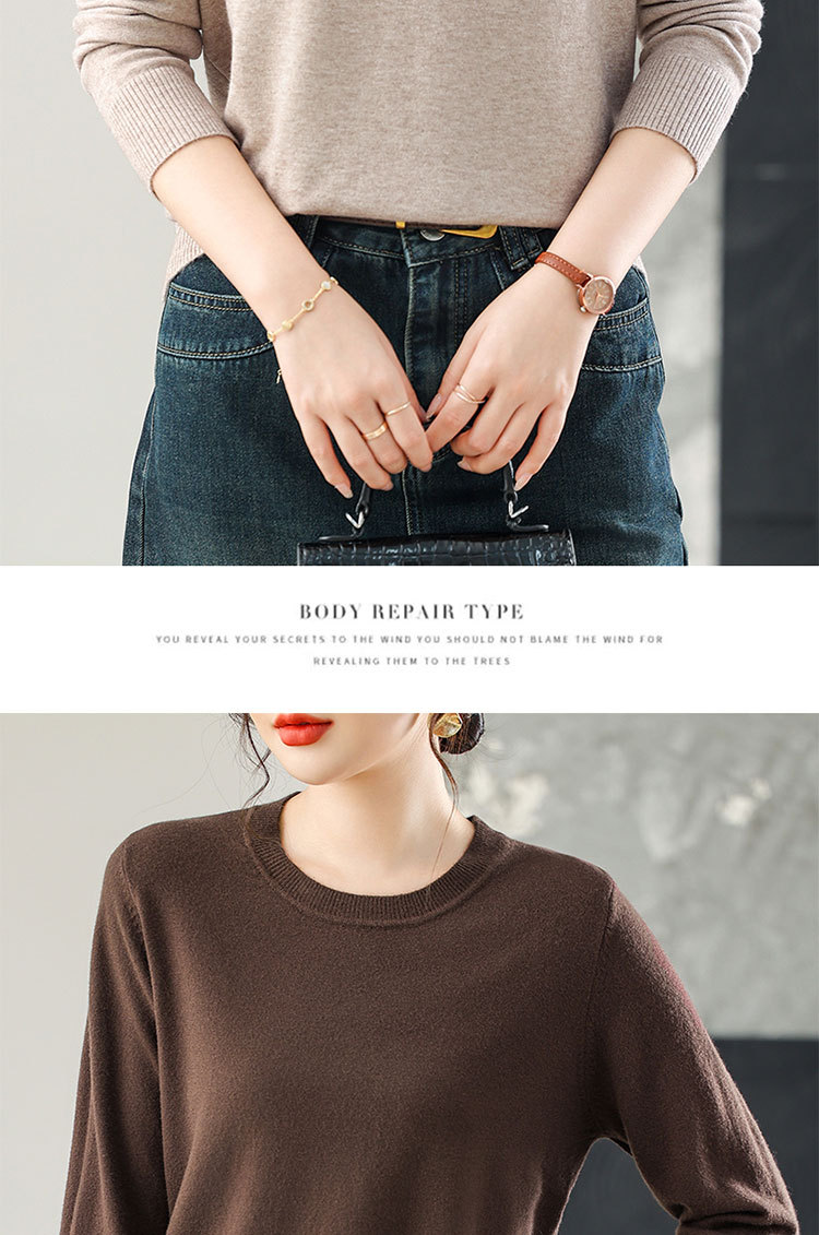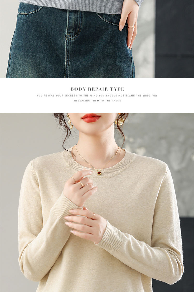 [メーカー直販] 春と秋の新作ラウンドネックボトリングシャツ、無地、多用途、ゆったり、痩身、年齢軽減レディースセーター