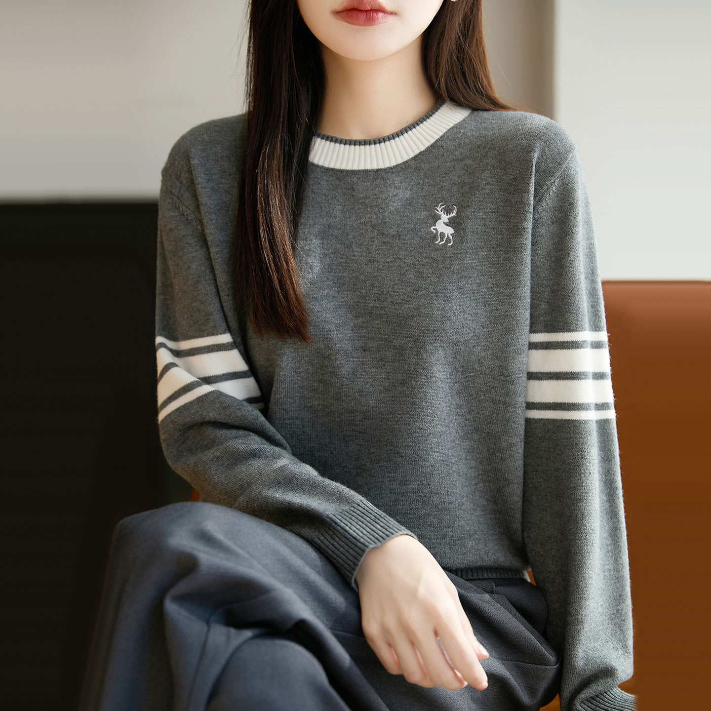【厂家直供】圆领拼色毛衣女士宽松秋冬新款刺绣短款百搭针织打底