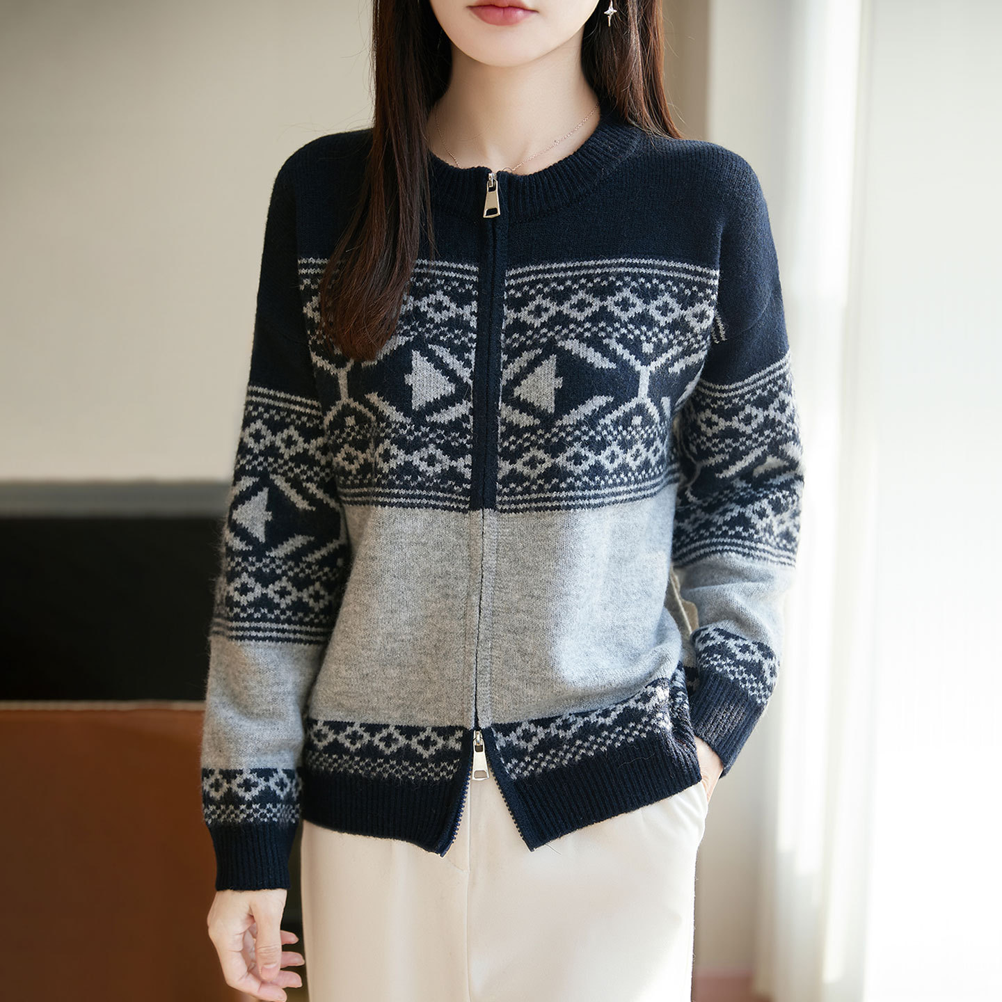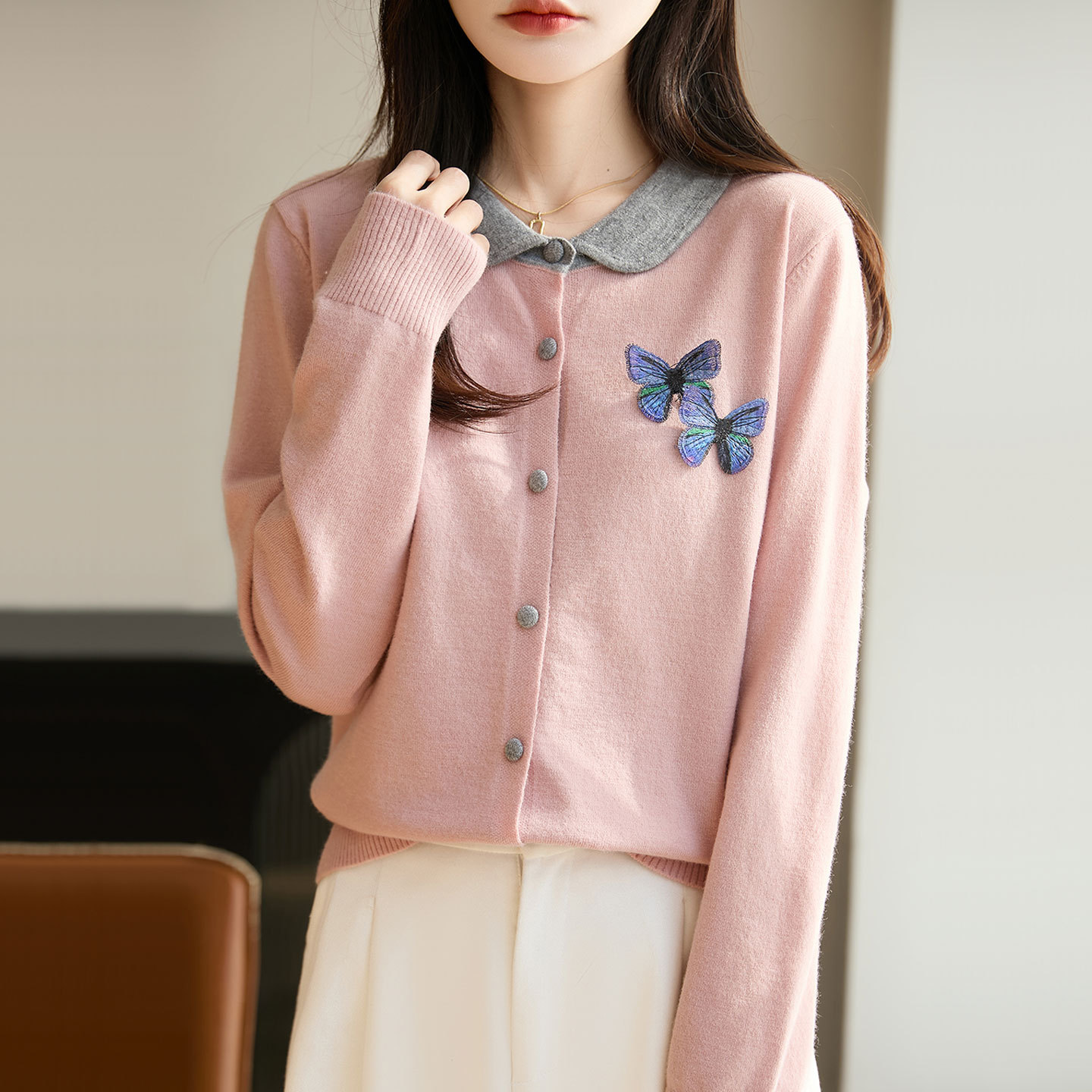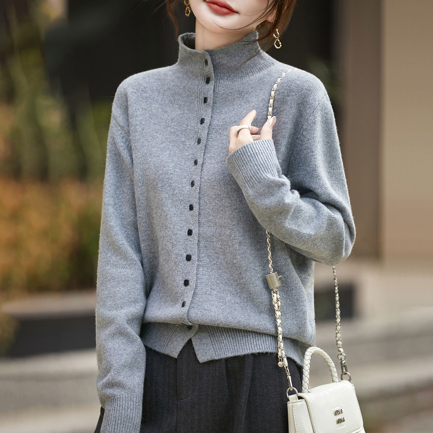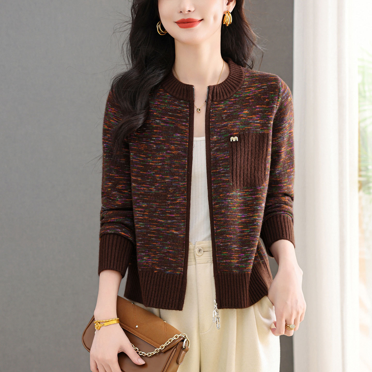 【メーカー直供】襟をめくってニットのカーディガンを着ます。