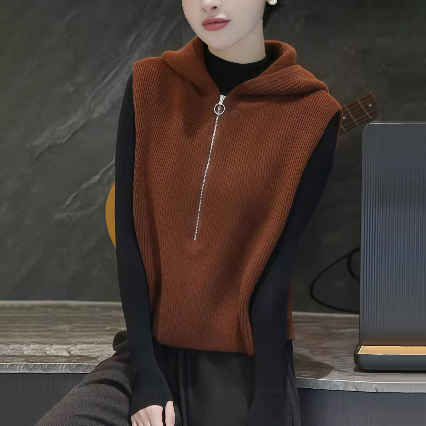 【厂家直供】秋冬新款连帽无袖背心毛衣女士宽松外穿短款坎肩上衣