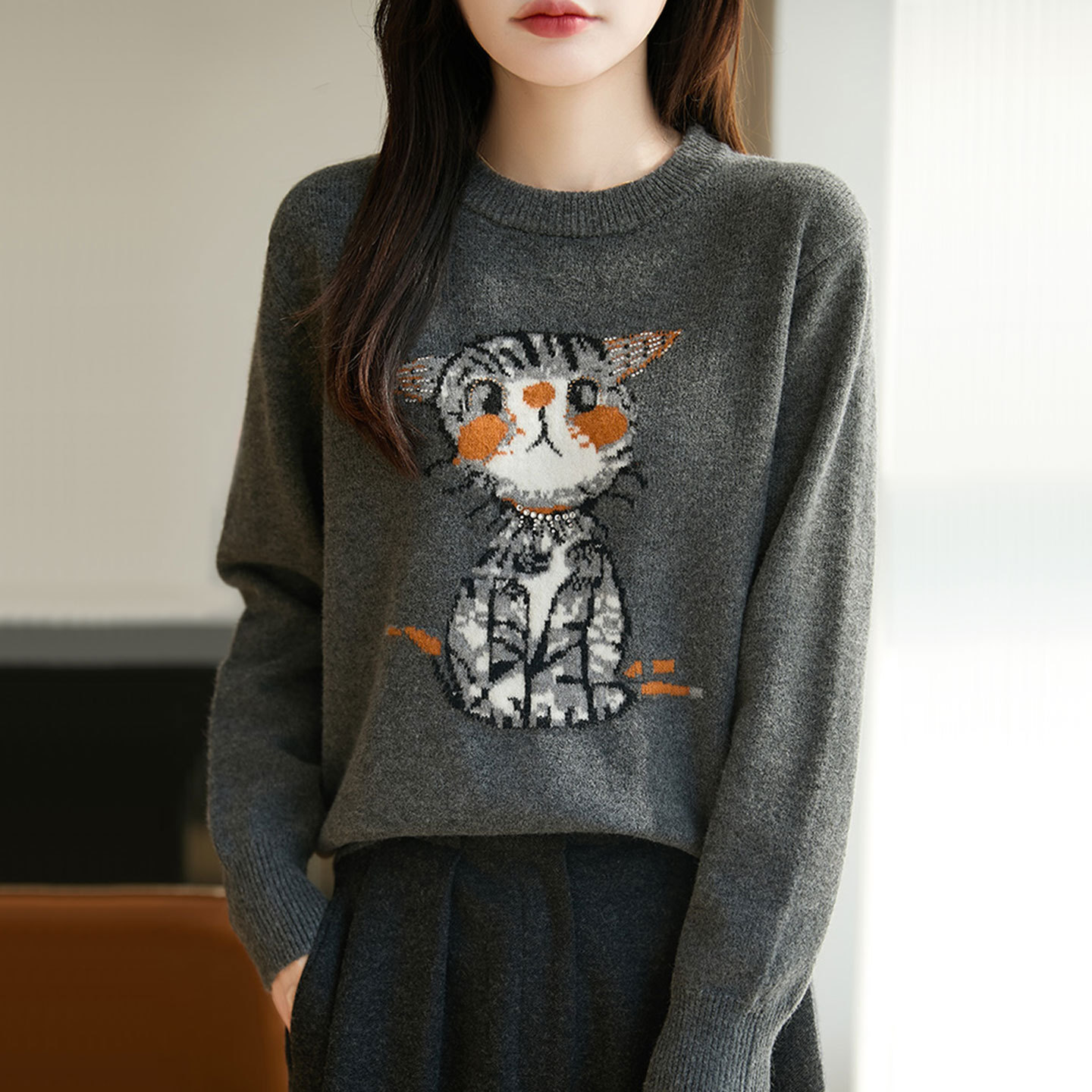 【厂家直供】小猫刺绣圆领毛衣女宽松减龄秋冬显瘦百搭针织打底衫