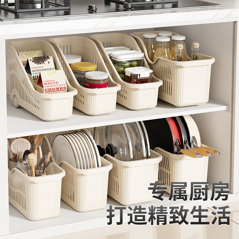 家用厨房锅具收纳调料杂物收纳筐锅盖收纳篮橱柜带滑轮桌面储物筐