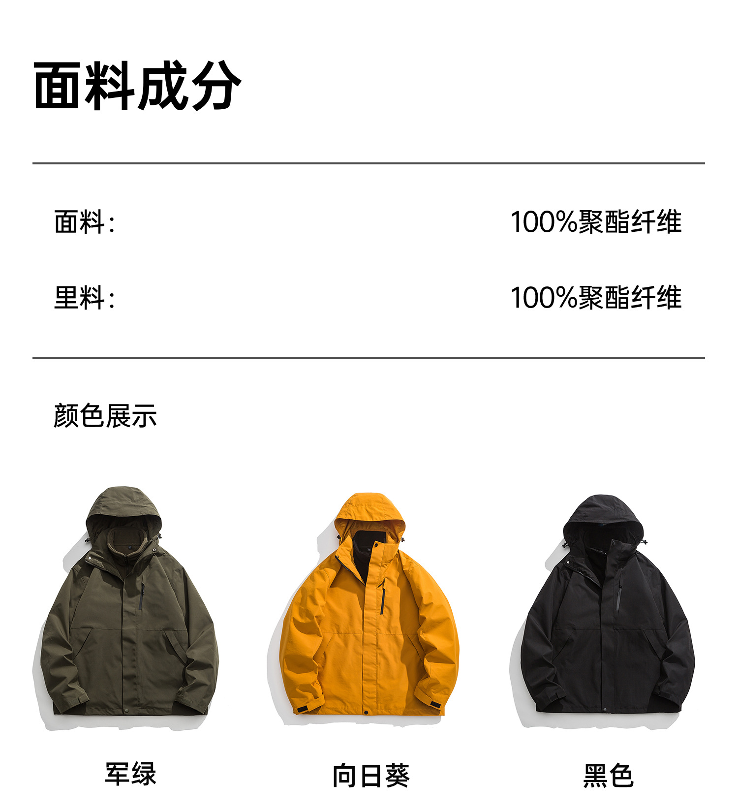 颜色 幻影黑(单夹克),军绿(单夹克),卡其(单夹克),深蓝(单夹克),幻影黑(三合一),军绿(三合一),卡其(三合一),深蓝(三合一),向日葵(三合一)