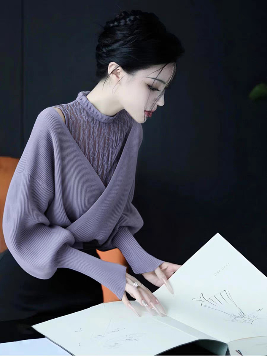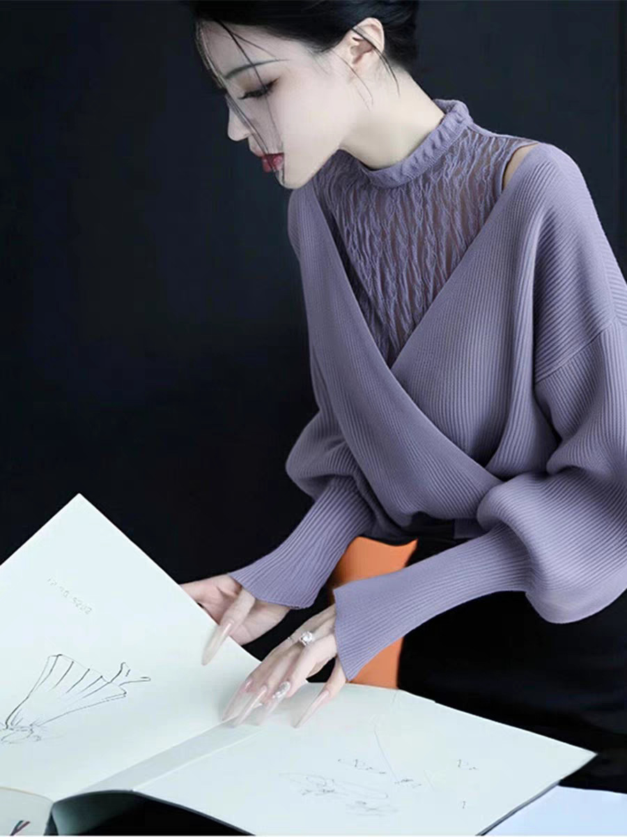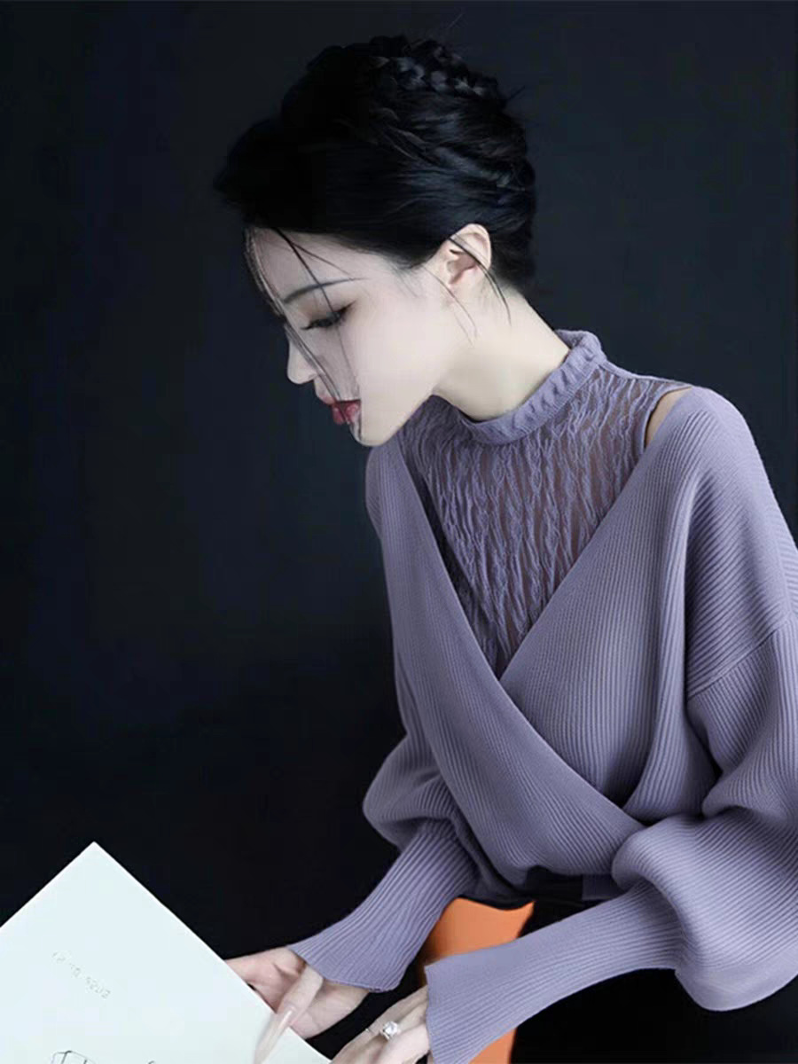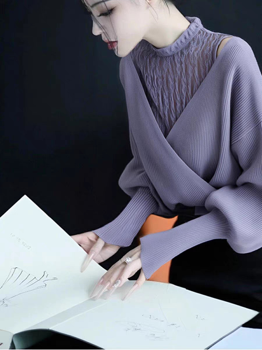 小众设计感紫色蕾丝拼接针织衫女2025秋季独特漂亮巨好看显瘦毛衣