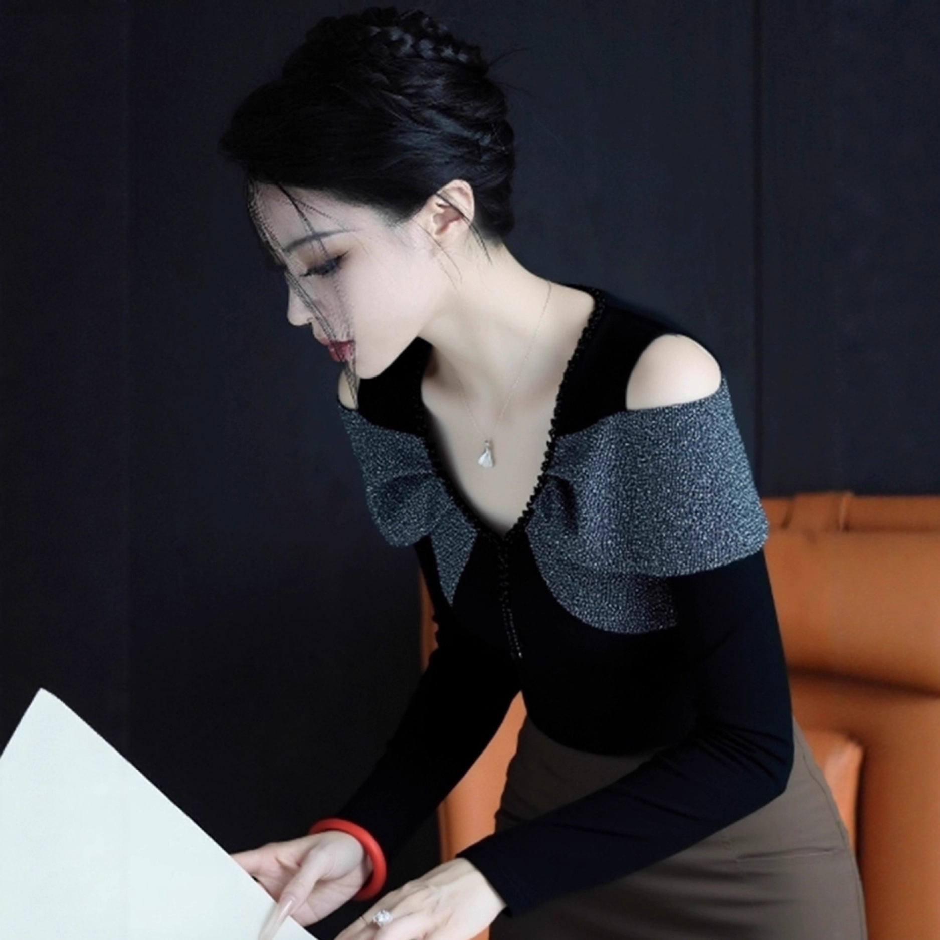 洋气欧货时髦超好看独特漂亮上衣女精致黑色烫钻拼接露肩T恤冬季