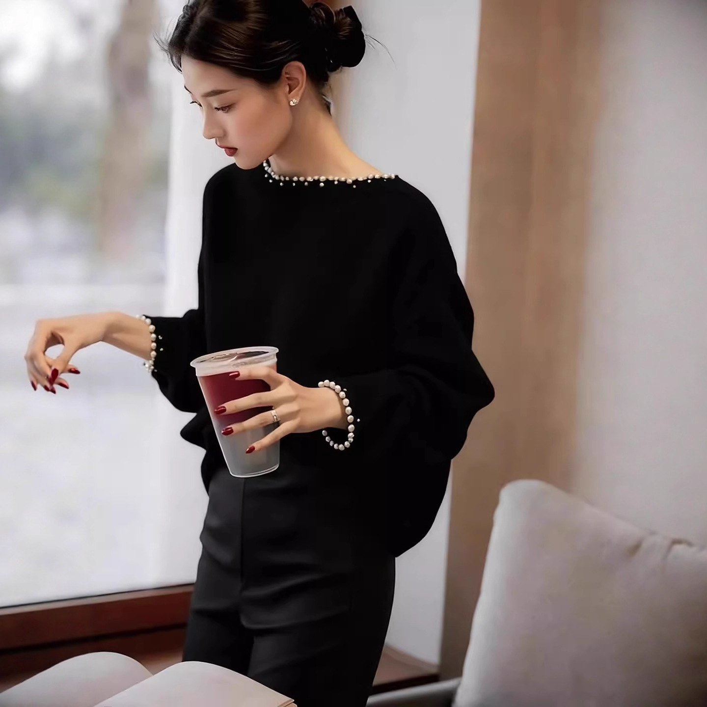 法式黑色钉珠一字领针织衫女2025秋新款慵懒风高级感宽松毛衣上衣