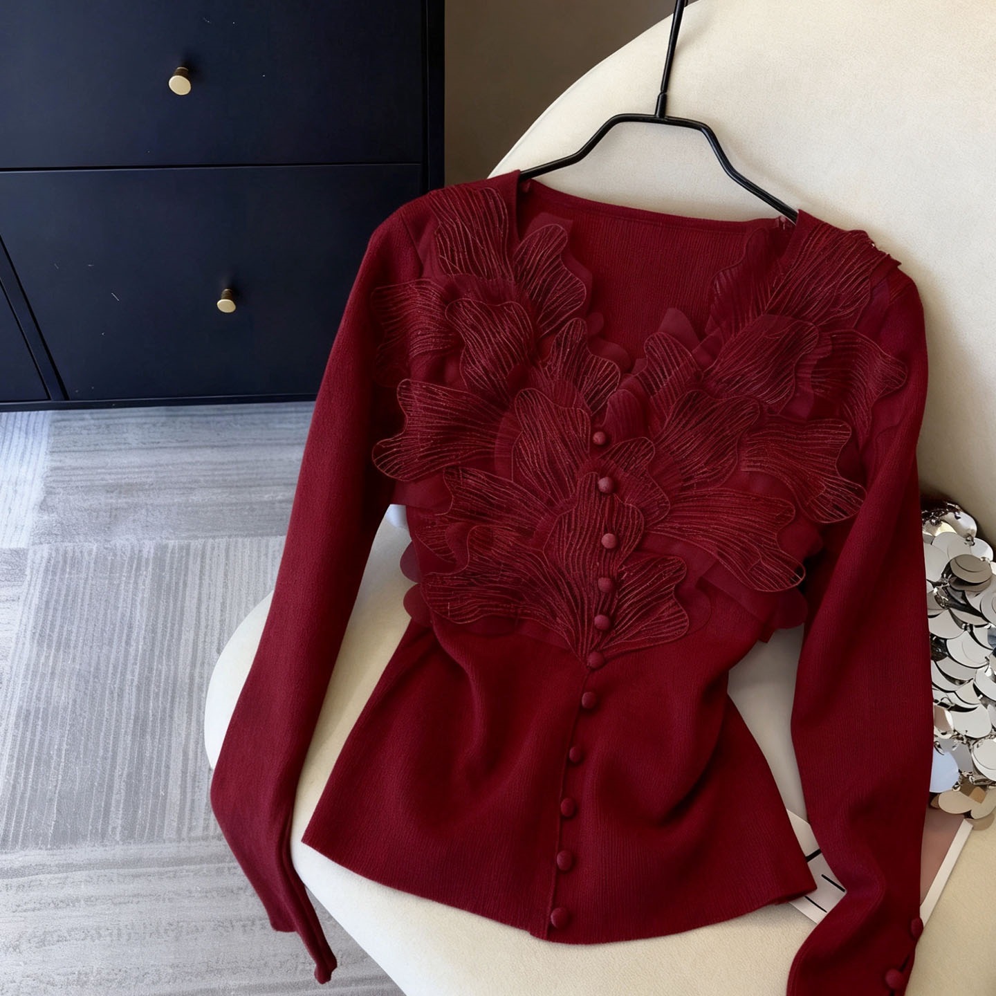 法式甜美蕾丝花边v领针织衫女秋冬款超显白酒红色修身显瘦上衣