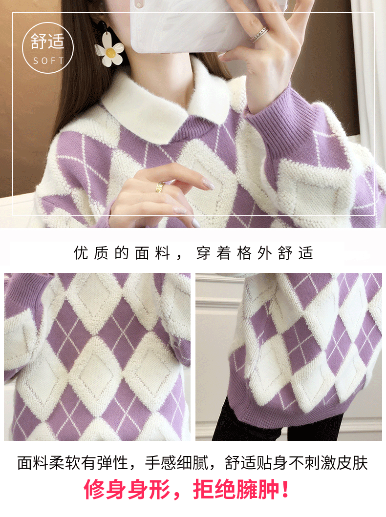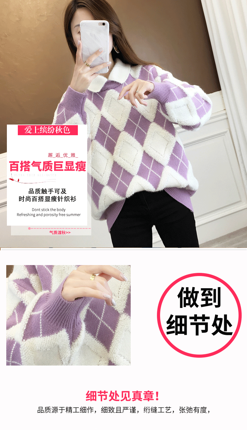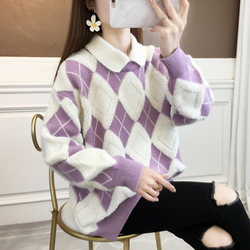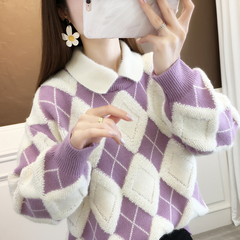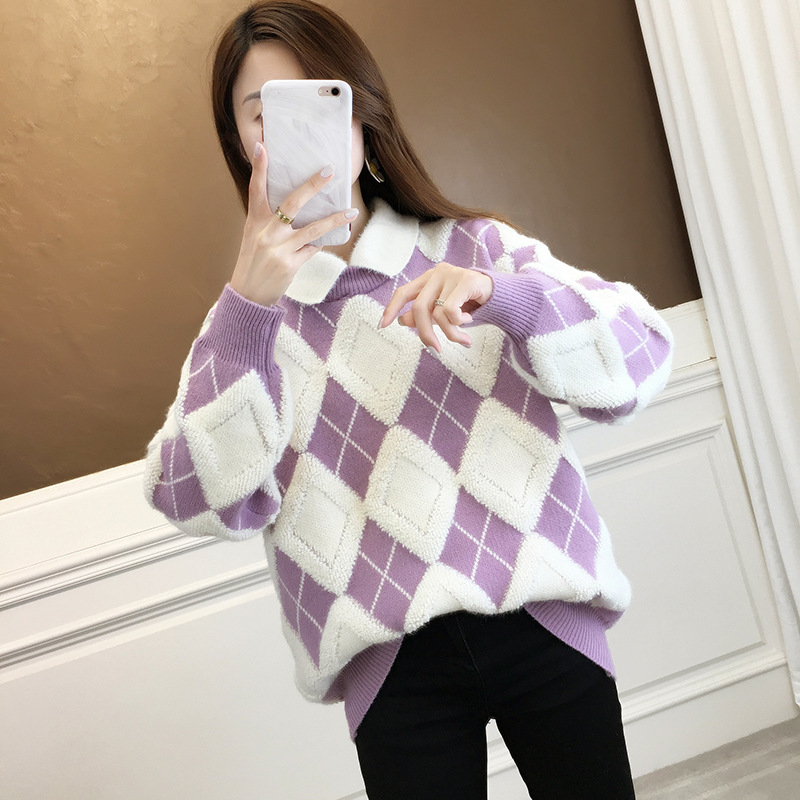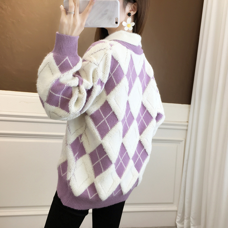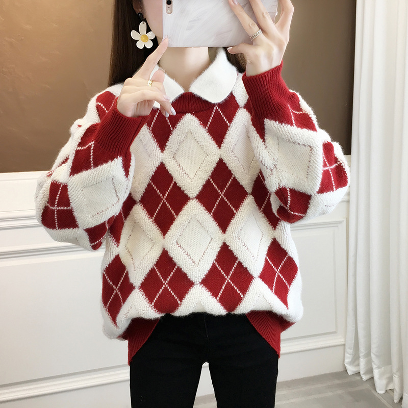 ヨーロッパスタイルのゆったりとしたカジュアルなカシミヤ素材の秋冬千鳥格子柄ハイネックセーター(レディース)
