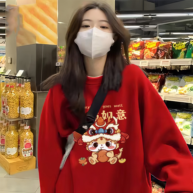 赤い裏起毛スウェットシャツ、女性用厚手コート、ラウンドネック、フードなし、高級感、秋冬、2026年、新年、干支年服