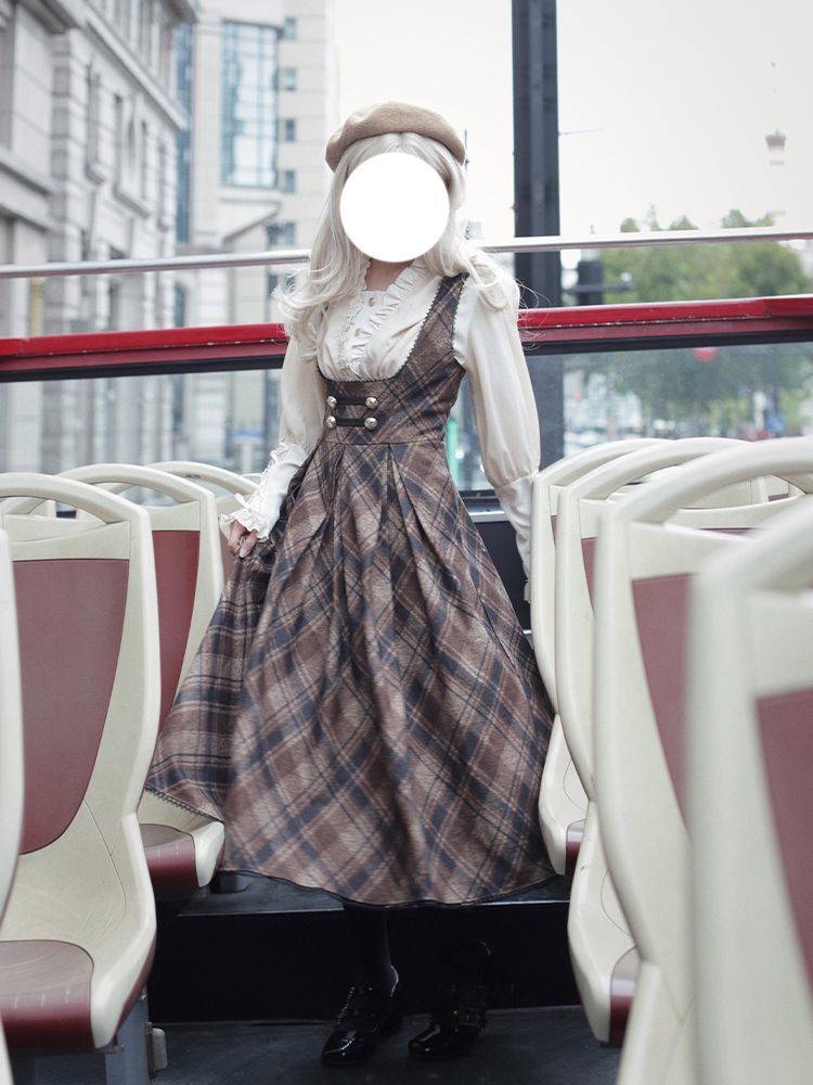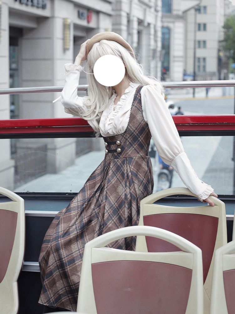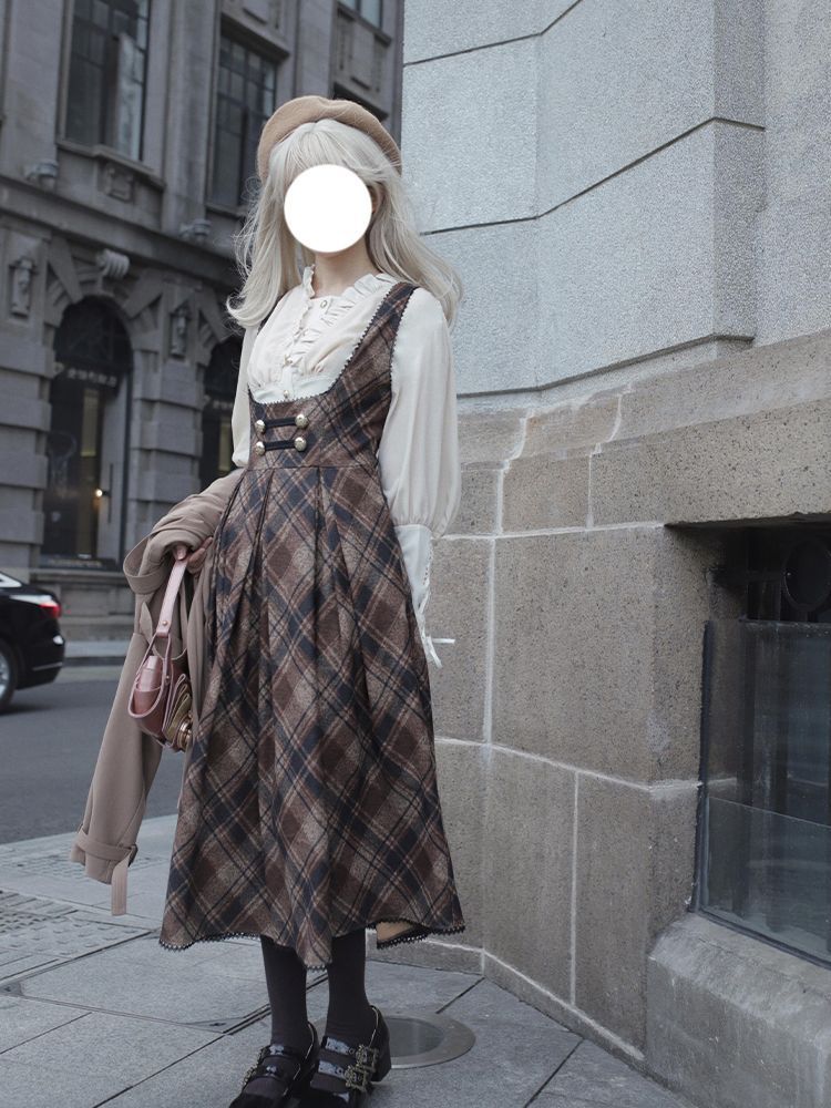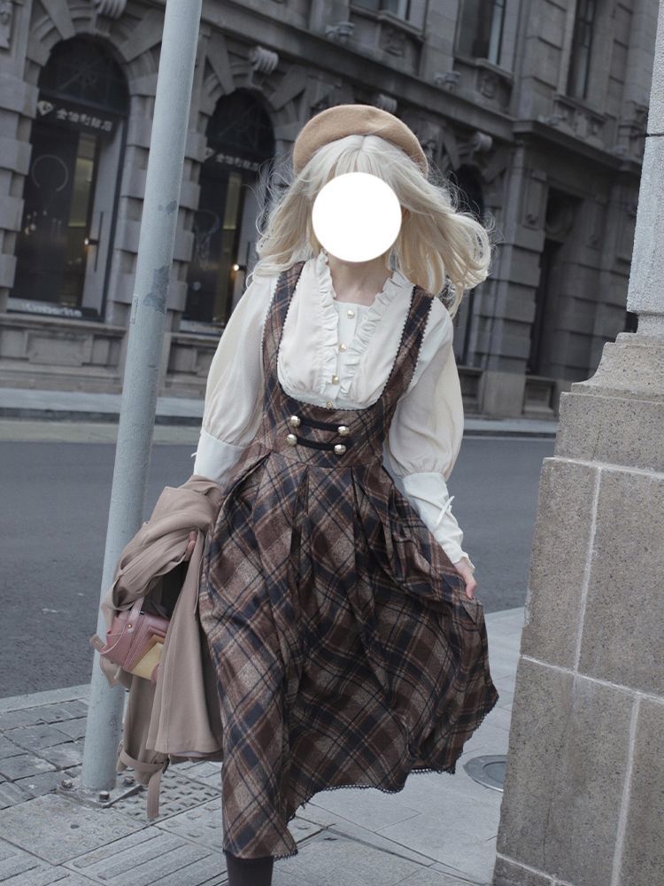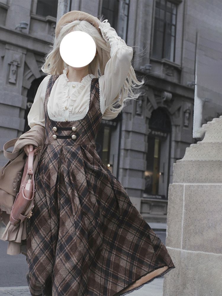 2025秋冬经典棕色格纹瞎裁收腰背带裙+花边束袖衬衫洛丽塔两件套