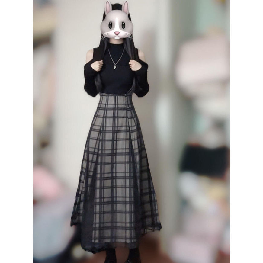 日系复古黑色修身上衣格纹半身裙两件套秋季新款小众百搭气质套装