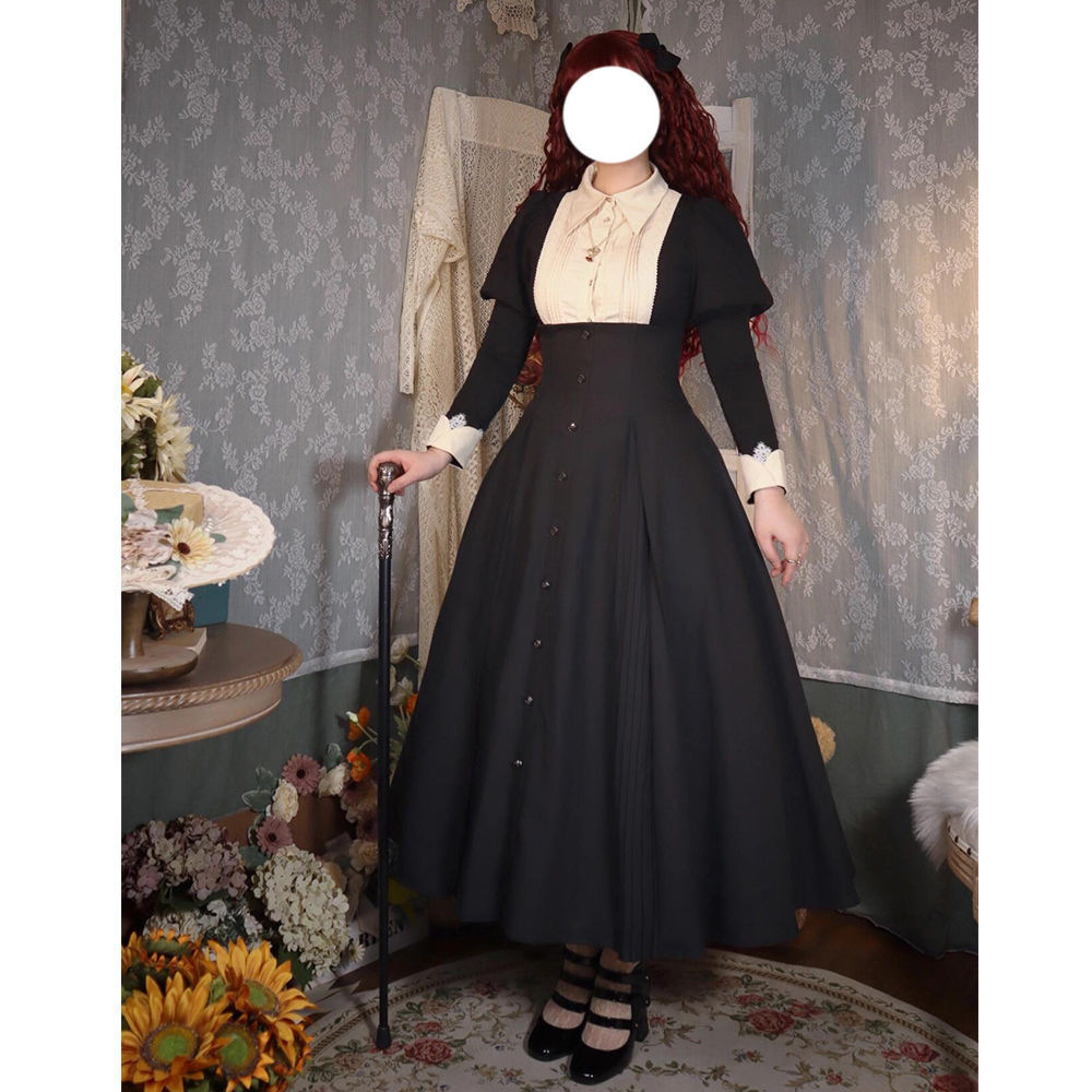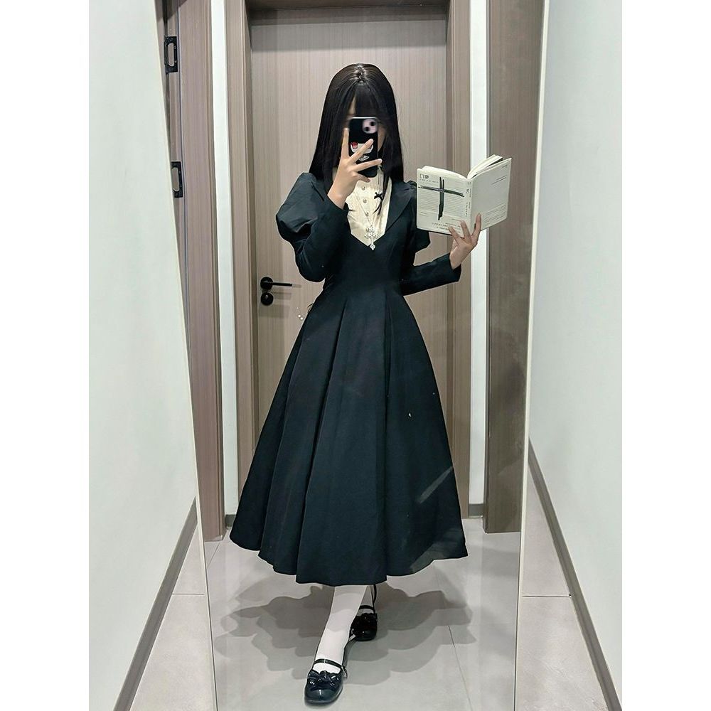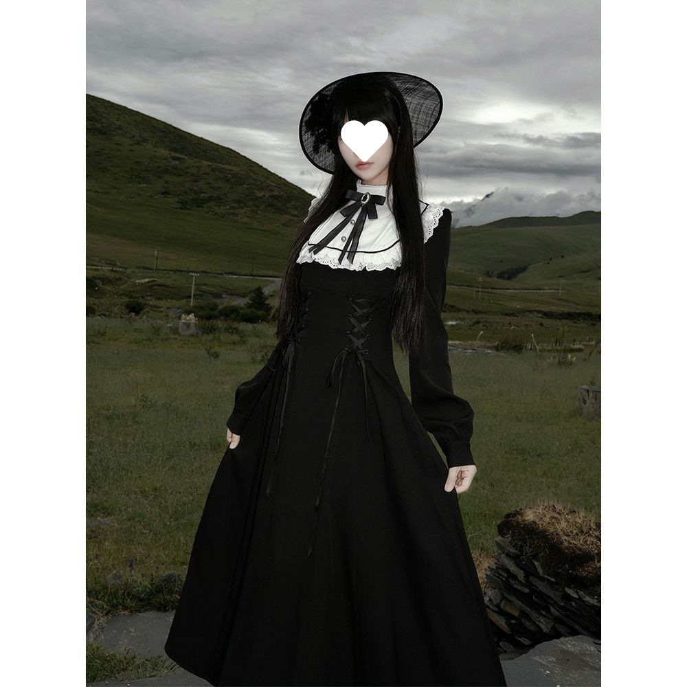 黑麻麻 暗黑修女风lolita复古cla六片裁收腰拼色泡泡袖长款连衣裙
