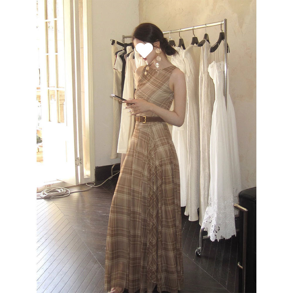 ストレッチツイストスイングドレスレトロチェック柄ドレス女性のための 2025 夏の新しいウエストロングスカートベルト付き